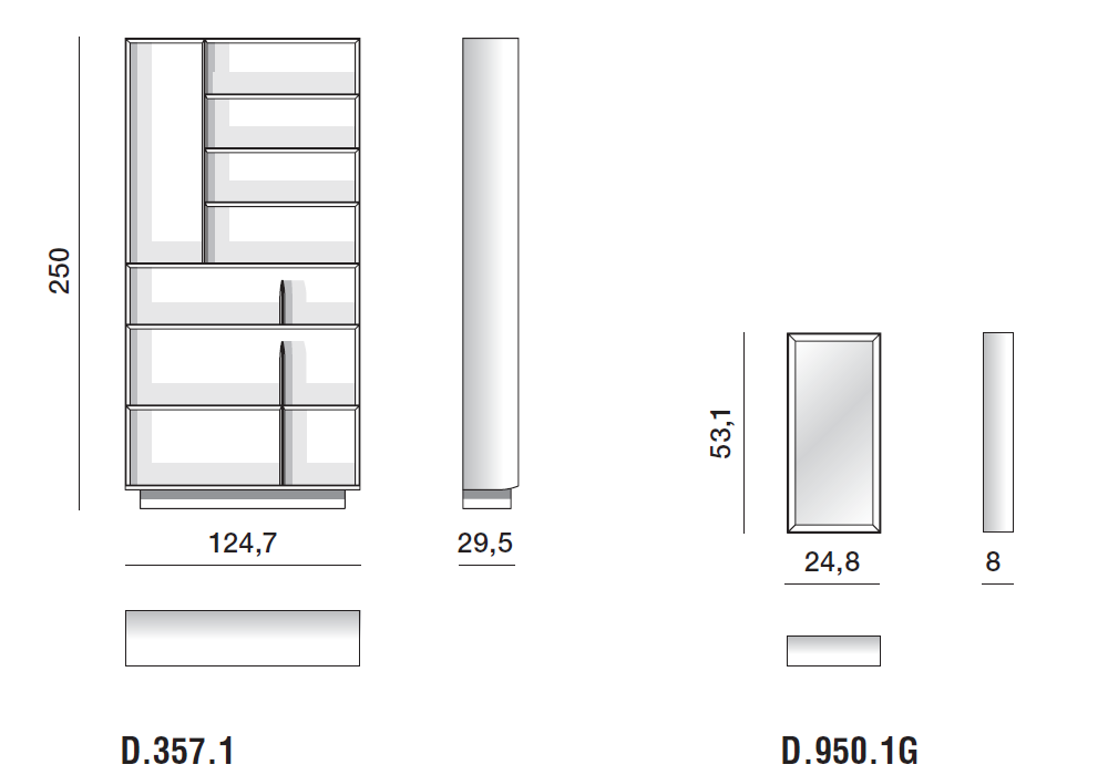 D.357.1 firmata da Gio Ponti per Molteni&C è una libreria realizzata in multistrato sagomato con rivestimento in olmo, in parte con finitura trasparente naturale, in parte verniciato a mano in colore bianco. È disponibile nella versione con o senza specchiera applicata.
