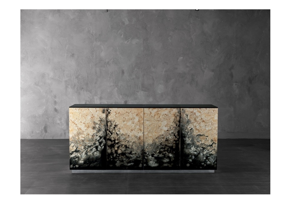 Atlanta firmata da Rugiano è una madia con quattro ante con decoro in differenti finiture e struttura in legno laccato. Dettagli in ottone bronzato o cromo.