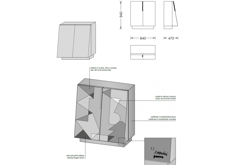 Schermo firmata da Alessandro Mendini per Porro è una madia quadrata su basamento con anta spiovente obliqua, realizzata con un disegno intarsiato sul fronte ottenuto accostando 3 diversi legni - olmo, rovere e acacia - secondo composizioni geometriche astratte che sposano gli spigoli del triangolo alle linee curve del cerchio secondo direzioni inattese.