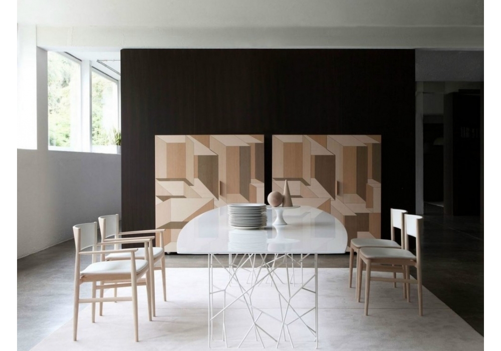 Inlay è una madia disegnata da Front per Porro. Inlay recupera la tecnica dell’intarsio, una tradizione antica e preziosa.Una credenza per la zona pranzo ricoperta con un decoro evocante una composizione di parallelepipedi che si intersecano nello spazio, dall’effetto tridimensionale.