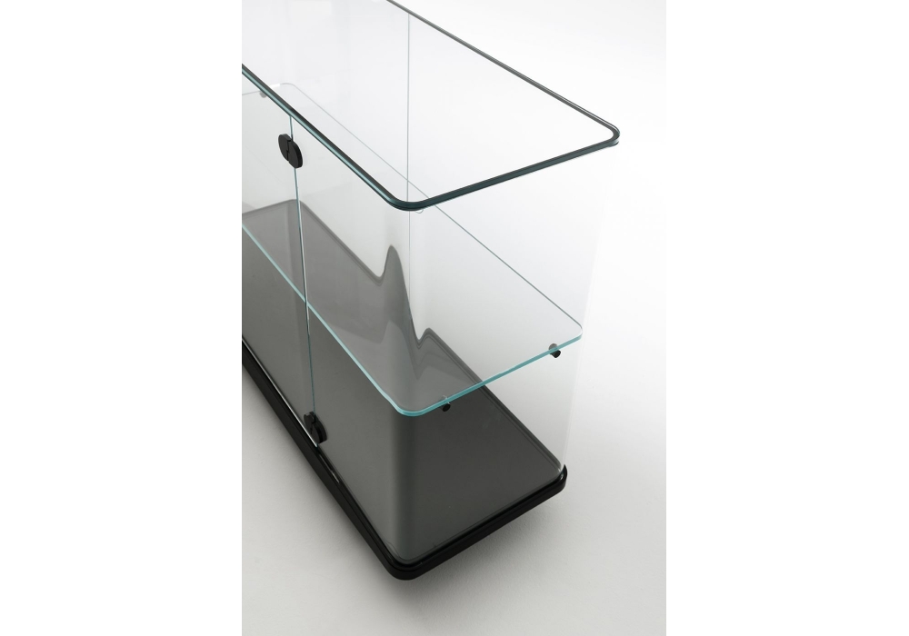 Collector firmata da Edward Barber & Jay Osgerby per Glas Italia è una vetrina con fianchi curvati che combaciano con la sagomatura del piano in cristallo trasparente o cristallo argentato. Le basi sono in massello di frassino laccato nero poro aperto. Disponibile in diverse dimensioni.