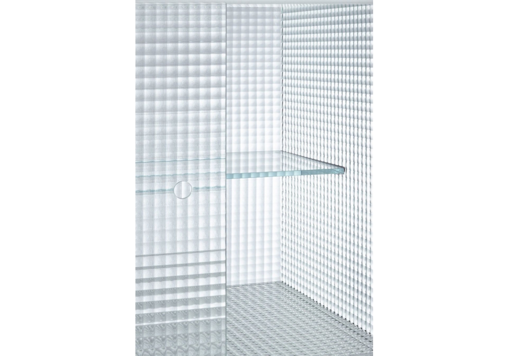 Commodore firmata da Piero Lissoni per Glas Italia è una madia realizzata in cristallo stampato a righe o quadretti. Le gambe sono in metallo cromato lucido, mentre le ante scorrevoli sono inserite in guide di plexiglass con finitura a specchio. Il cristallo è temperato e incollato a 45°, con dettagli verniciati a specchio.