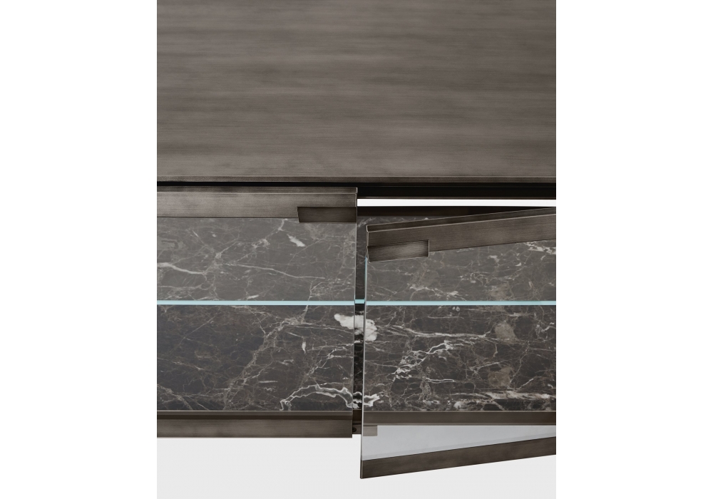 Pandora Light firmata da Pinuccio Borgonovo per Gallotti&Radice è una madia in cristallo 8mm extralight temperato, verniciata in bronzo patinato. Dotata di ripiani in cristallo 8mm extralight temperato. Struttura e maniglie in metallo verniciate bronzo patinato. Piano inferiore in legno rivestito in foglia oro oppure in marmo Emperador Brown spazzolato. Collezione in edizione numerata.