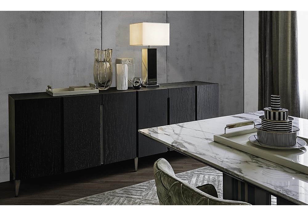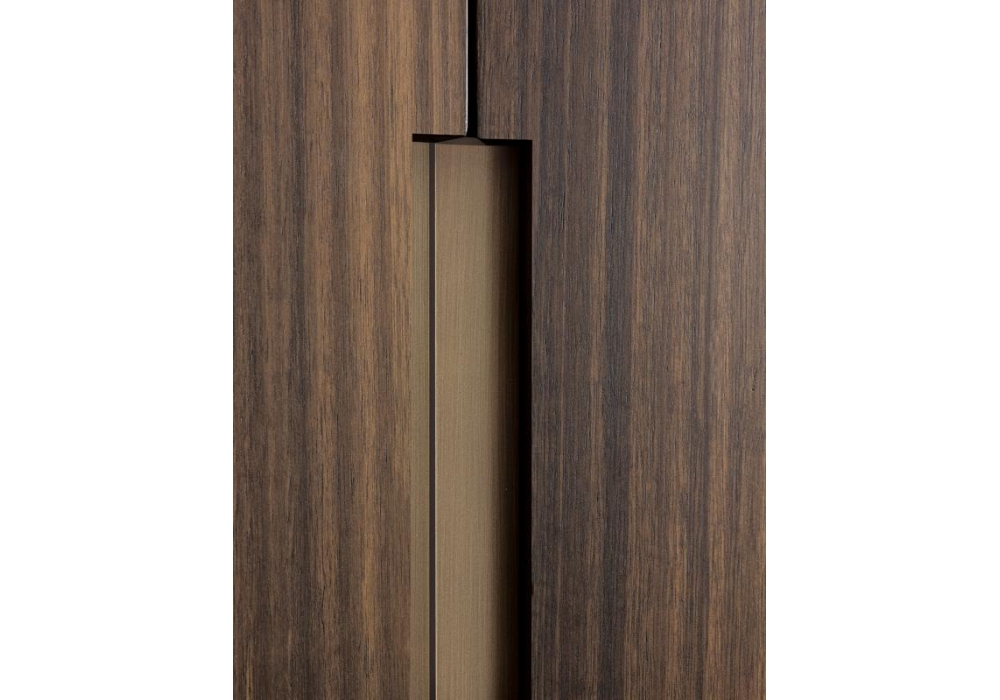 Garbo di Casamilano Studio è una madia con struttura in MDF rivestito in eucalipto termo trattato o rovere fumè, maniglie e piedini in metallo in finitura ottone e ripiani in vetro bronzo temperato.