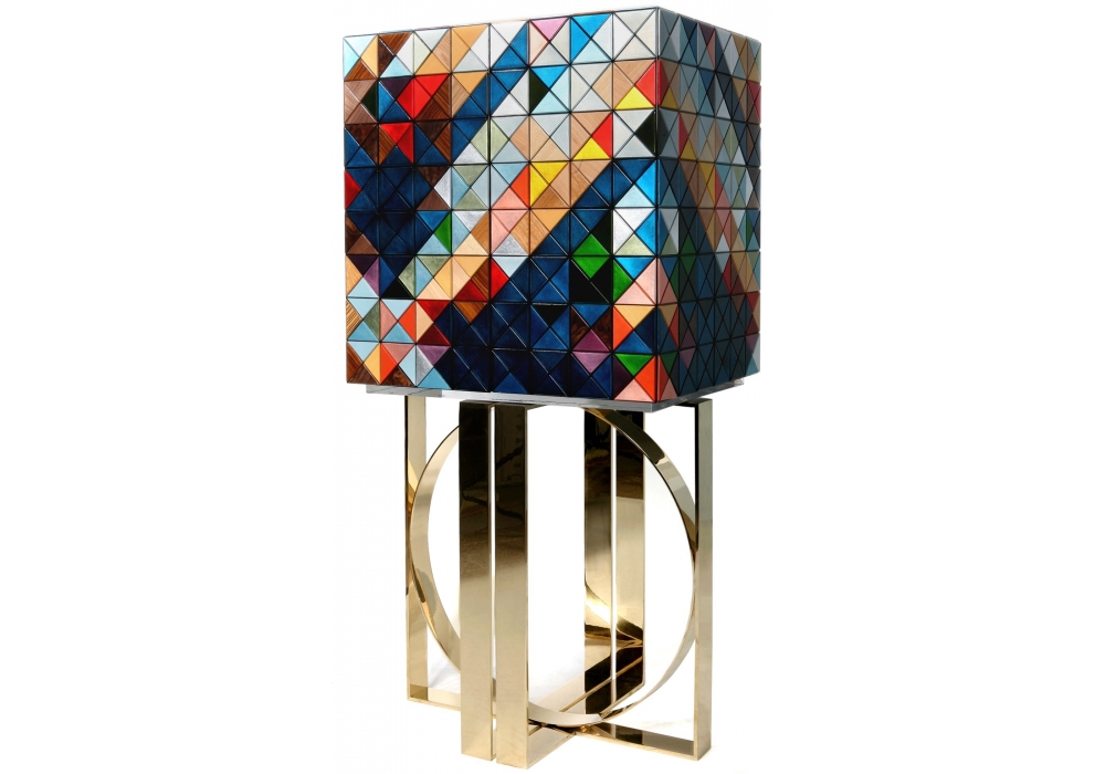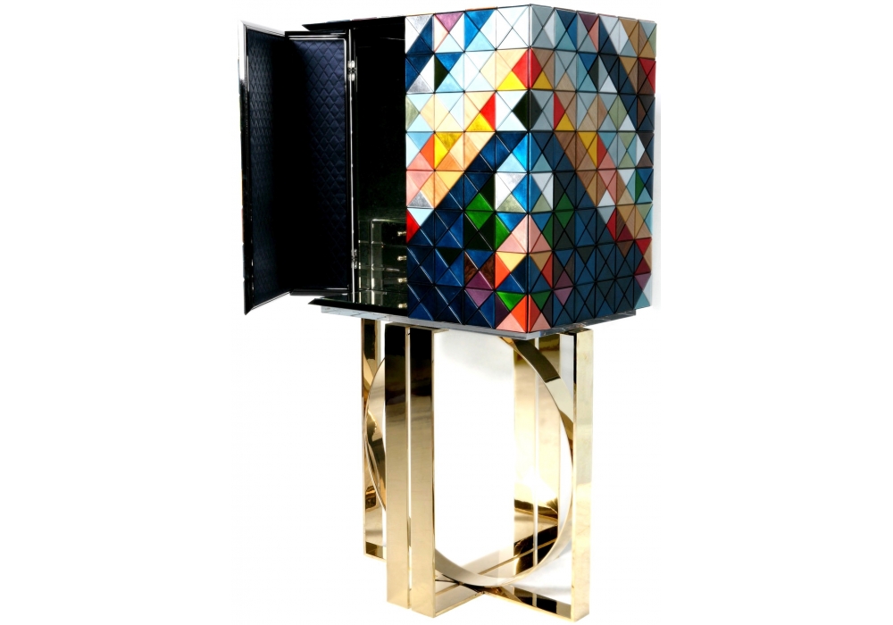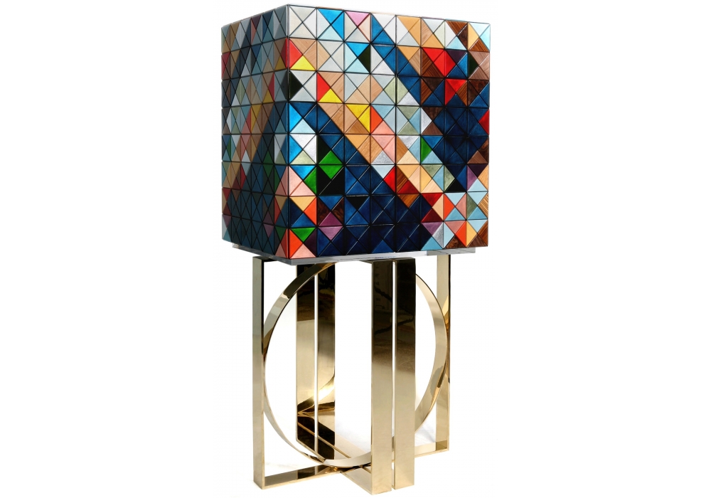 Pixel firmata da Boca Do Lobo è una bellissima madia composta da 1088 triangoli di legno in una varietà di legni e finiture: foglia argento, foglia oro, lacche colorate, e dieci diversi tipi di foglia di legno (impiallacciatura ebano, noce africana, impiallacciatura zebrano, impiallacciatura di pioppo, palissandro. Due ante rifinite sulla parte interna in un tessuto di seta blu diamantato e trapuntato nascondono nove cassetti dai pomelli d'oro e uno spazio impreziosito da una finitura "invecchiata". Base: ottone lucido.