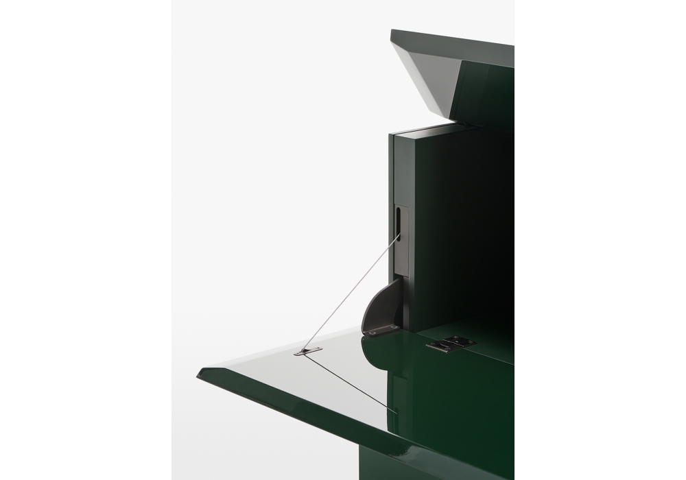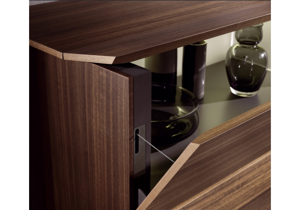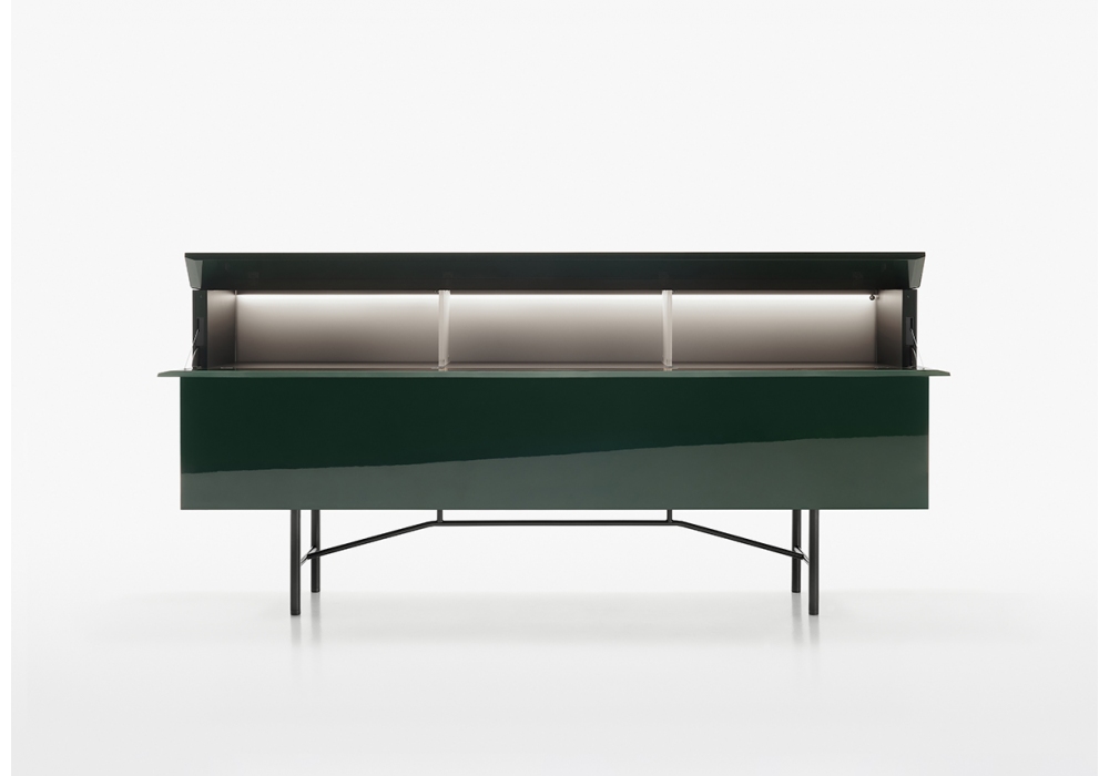 Grand Buffet firmata da Massimo Castagna per Acerbis è una madia alta dal design contemporaneo, caratterizzato dall’insolito taglio orizzontale delle ante, ma con altezza e proporzioni da buffet tradizionale. Grande volume e grande capienza, chiusi da due ante asimmetriche, dai profili finemente diamantati. Il vano superiore adotta un’evoluzione dell’innovativo sistema di apertura Dual-Flap®: con un semplice e unico gesto mentre si apre l’anta, una parte del top si solleva lasciando completamente in vista l’interno, rischiarato da un fondo retroilluminato a LED. L’anta superiore, da aperta, offre un piano d’appoggio a un’altezza particolarmente comoda per servire.