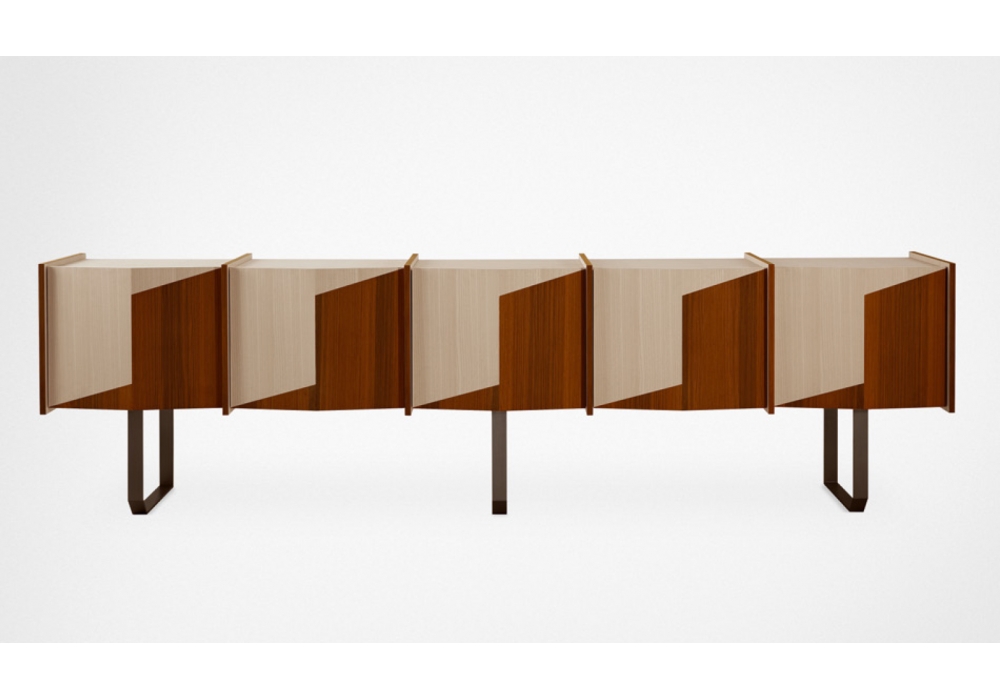 Diedro firmata da Pietro Russo per Gallotti&Radice è una madia in Taba Frisé bianco e Tanganika nero con struttura in metallo laccato ottone satinato. Disponibile anche in frassino e palissandro con struttura nero bronzato o Acero Frisé grigio scuro oppure in legno intarsiato con motivo “Tweed” con struttura in metallo laccato nero. Dotata di ripiano in cristallo extralight 8mm temperato e schienale interno specchiato 6mm naturale.