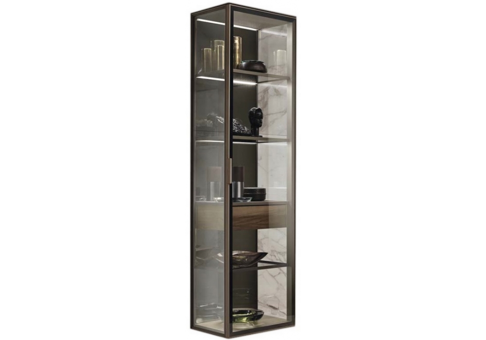 Alambra firmata da Giuseppe Bavuso per Rimadesio è una bellissima vetrina pensile con struttura bronzo, anta e fianchi in vetro riflettente chiaro, schienale in specchio grigio e ripiani in vetro trasparente grigio. Cassetto interno in essenza di noce con top e fondo in cuoio rigenerato castoro. Illuminazione interna opzionale a LED.