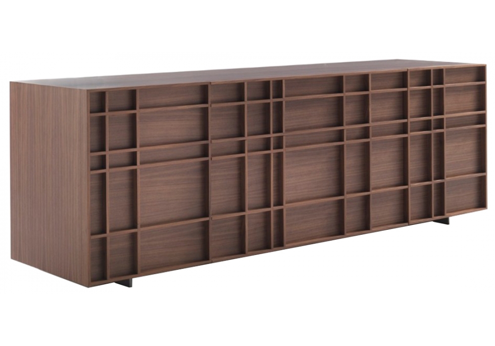 Kilt firmata da Marconato & Zappa per Porada è una credenza realizzata in noce canaletta e base in metallo nero opaco. Kilt è caratterizzata da un motivo decorativo frontale dal quale vengono ricavate le maniglie per l'apertura delle ante laterali, del cassetto superiore e del cassettone inferiore.