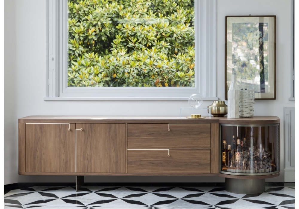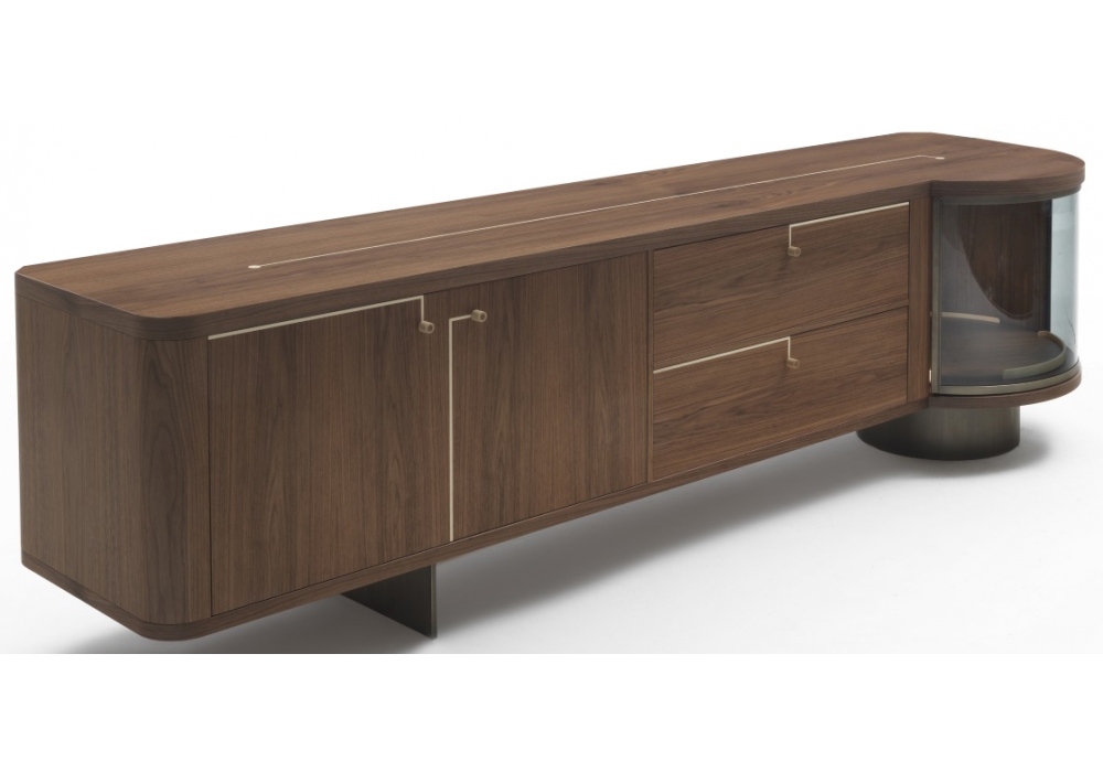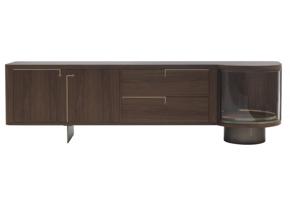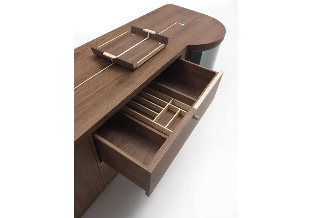 Rondo' firmata da Umberto Asnago per Porada è una madia con intarsio in acero naturale e base in ottone bronzato spazzolato con due ante e due cassetti. Disponibile anche nella versione con modulo bar aggiuntivo a destra con anta in cristallo fumè curvato, dotato di elemento girevole portabottiglie con illuminazione a LED. All’interno di un cassetto è presente un vano portabicchieri e un divisorio porta posate. Vassoio Rondo' incluso.