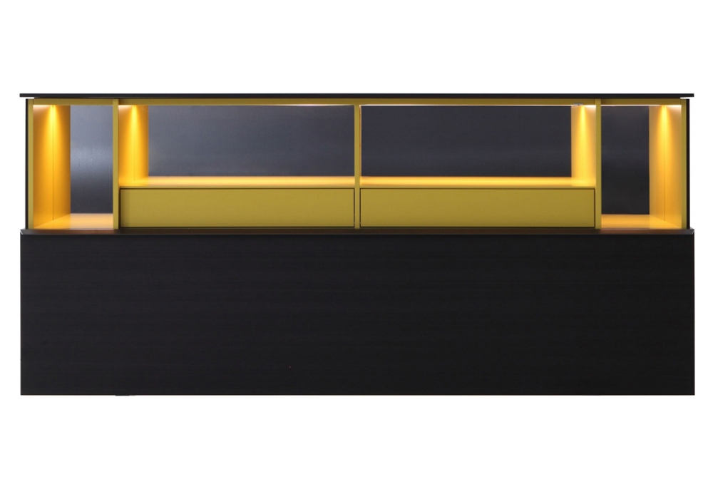 Gallery Low Cupboard firmata da Gabriele & Oscar Buratti per Porro è una madia-pensile realizzata in legno caratterizzata da un'anta che scorre in alto ed in basso. Ripiani interni in cristallo. Disponibile in 2 diverse dimensioni, con o senza illuminazione del fondale. Disponibile anche con piano in marmo.