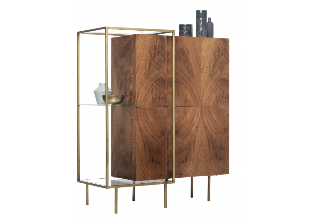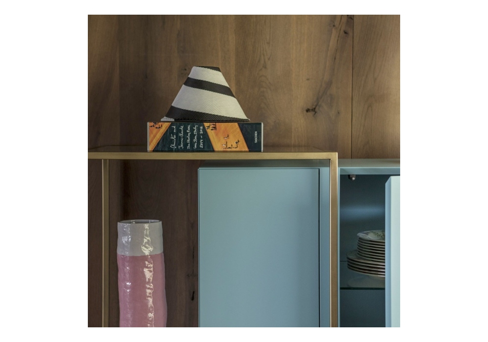 Zoom firmata da Uto Balmoral per Mogg è una madia con telaio in metallo, completa di ripiani in cristallo. Alla struttura in MDF viene applicata una laccatura goffrata in diversi colori oppure placcata in piuma di mogano. Il telaio in metallo è verniciato nero opaco oppure bronzo patinato.