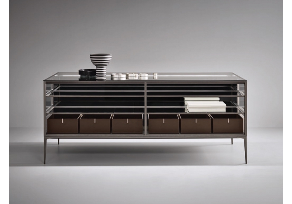 Alambra firmato da Giuseppe Bavuso per Rimadesio è un mobile espositore con struttura in alluminio e piano, ante e pannelli laterali in vetro, disponibile in diverse finiture. Ripiani in vetro grigio trasparente, schienale in specchio grigio e cassetti in noce con rivestimento interno in cuoio rigenerato castoro. Illuminazione a led interna opzionale.