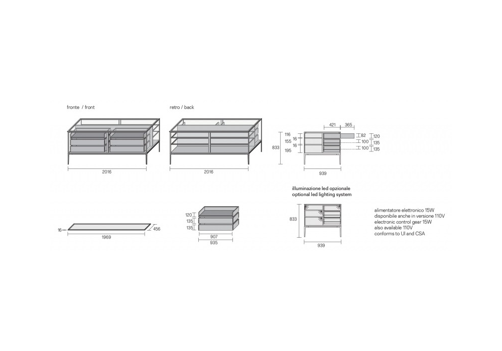 | Materiali di costruzione | Struttura in alluminio con piano, ante e pannelli laterali in vetro. Fondo interno realizzato in legno. Schienale in specchio grigio. |