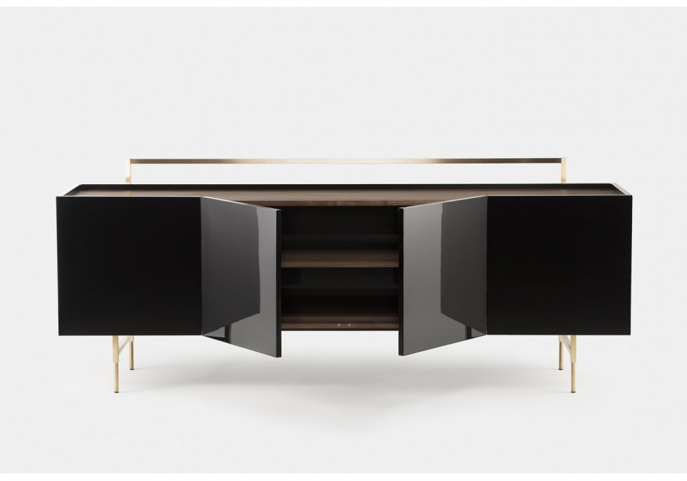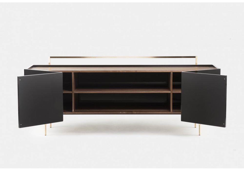 Trunk firmata da Neri & Hu per De La Espada è una madia con esterno realizzato in HDF verniciato e ripiani disponibili in diverse finiture. Struttura in ottone spazzolato.