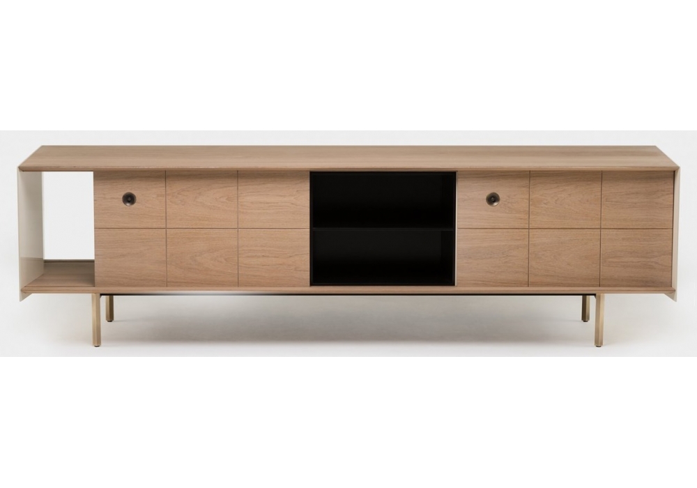 Mitch firmata da Luca Nichetto per De La Espada è una madia in legno con ante scorrevoli, pannelli verticali realizzati in HDF e piedini in ottone spazzolato.