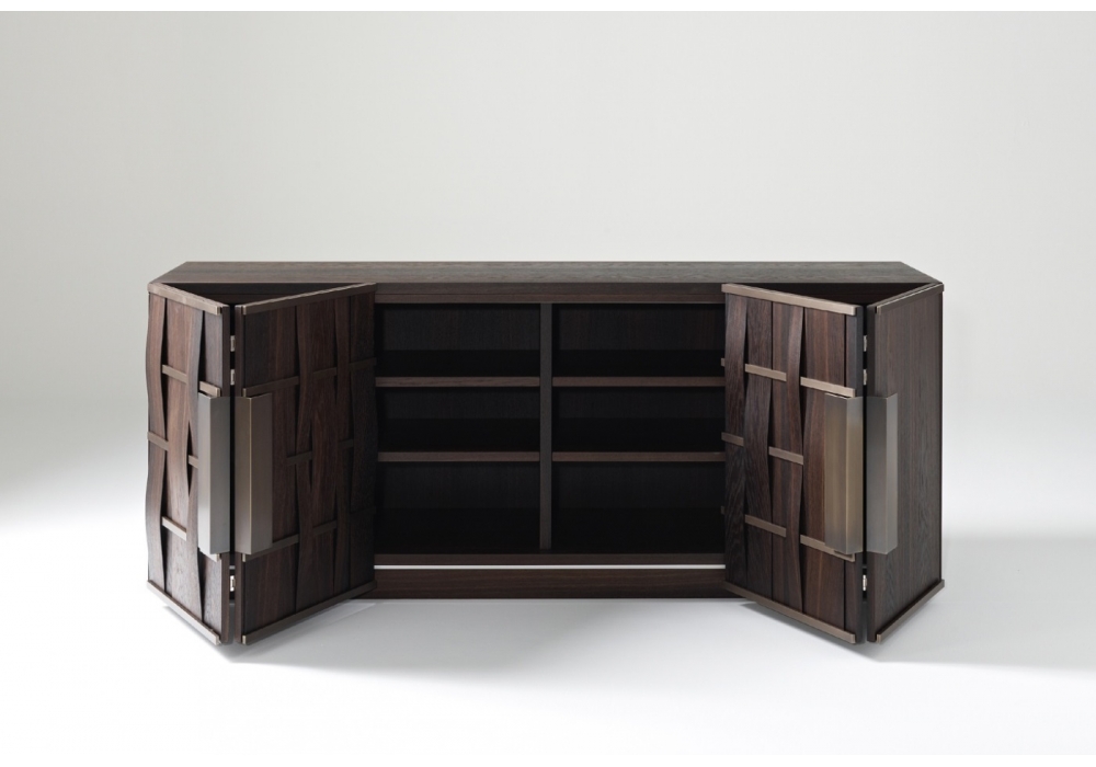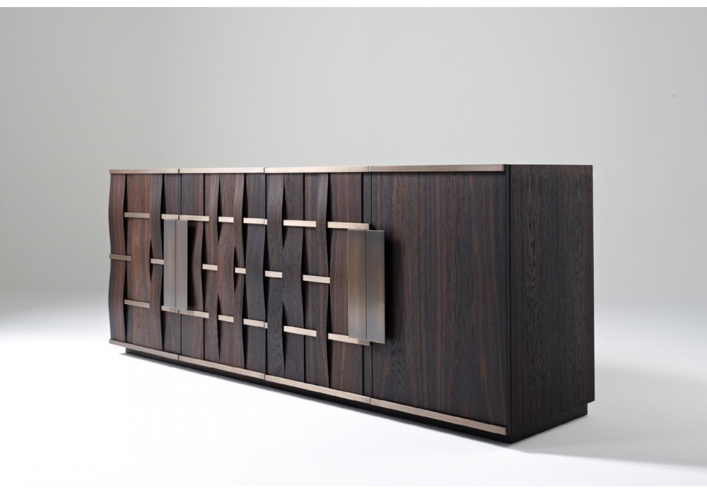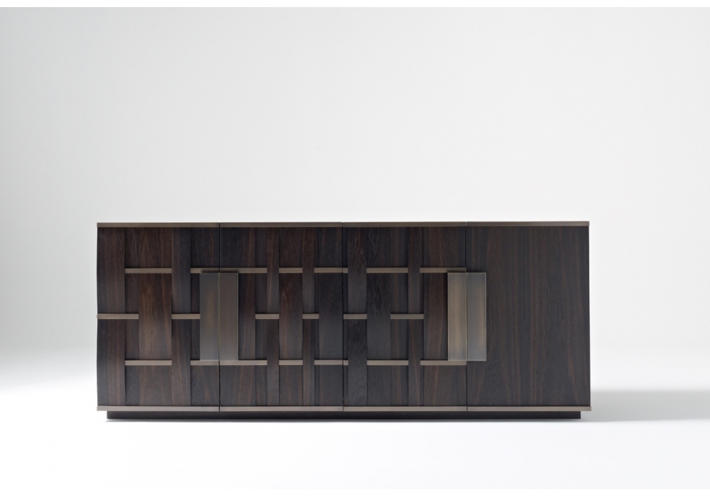 Celtic firmata da Ferruccio Laviani per Emmemobili è una madia con struttura e ante in pannelli impiallacciati e profili orizzontali in ottone brunito spazzolato a mano. Disponibile anche in diverse dimensioni e versioni.