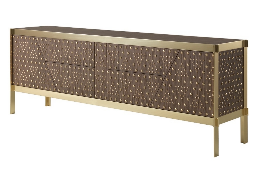 Dolly firmata da Ferruccio Laviani per Emmemobili è una madia realizzata con pannelli impiallacciati e racchiusa in una struttura di ottone. La facciata e le spalle sono decorate con borchie tornite in ottone, di diametri diversi. Disponibile in 2 modelli: con ante o con ante e cassetti. Spazi interni dotati di una mensola in legno ciascuno.