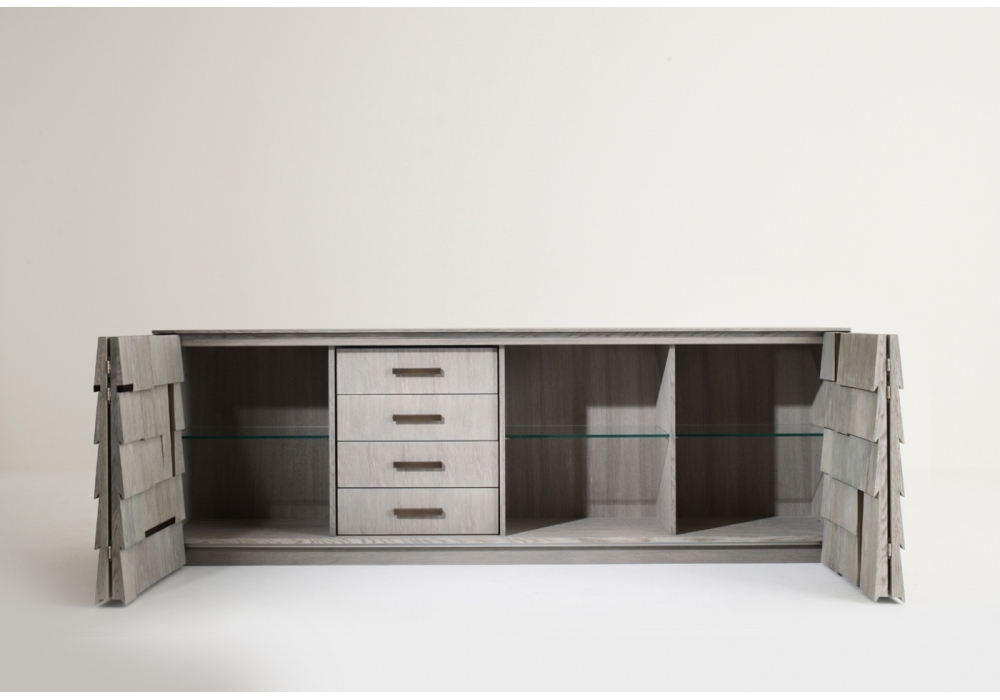 Tiles firmata da Ferruccio Laviani per Emmemobili è una madia caratterizzata dalla copertura sui 3 lati con elementi sagomati in massello di rovere dalle svariate forme, come una sorta di tetto a tegole. Maniglie ed inserti decorativi in ottone brunito. Cassettiera interna a richiesta. Disponibile anche in 3 dimensioni.