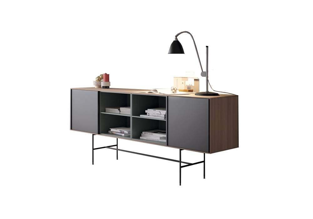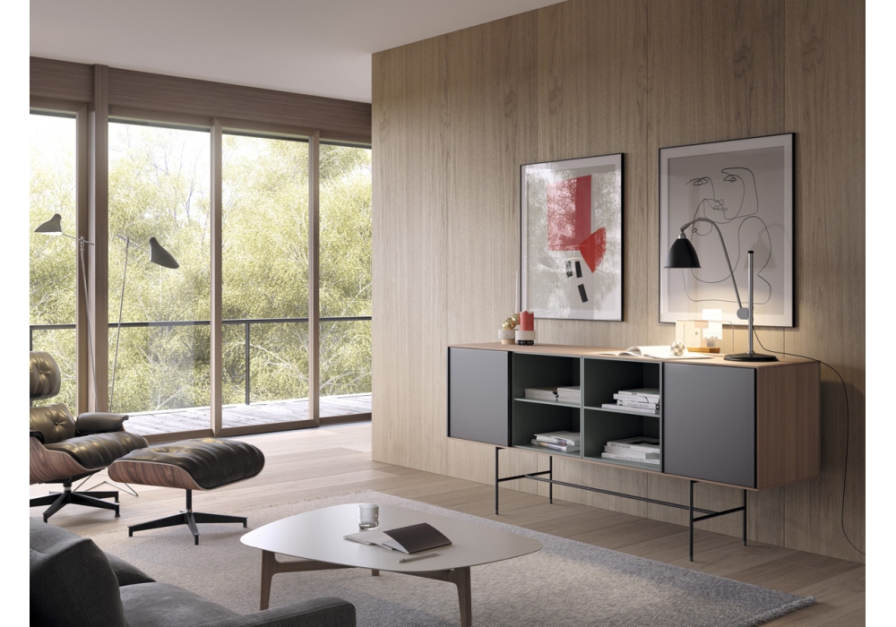 Aura firmato da Angel Martí ed Enrique Delamo per Treku è una madia alta della collezione Aura. La composizione presenta una struttura su gambe in metallo, con una struttura in legno, quattro vani a giorno con due ante scorrevoli.