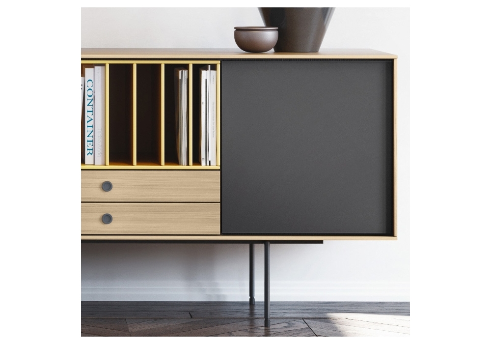 Aura firmato da Angel Martí ed Enrique Delamo per Treku è una madia della collezione Aura. La composizione presenta una struttura su gambe in metallo con una struttura in legno, tre ante finitura laccata, due cassetti con finitura legno e un vano a giorno con finitura laccata.