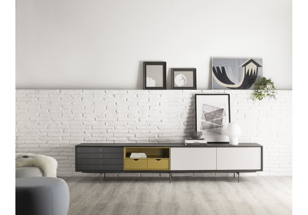 Aura firmato da Angel Martí ed Enrique Delamo per Treku è una madia bassa della collezione Aura. La composizione presenta una struttura in legno su gambe in metallo, due ante finitura laccata, un vano a giorno con cassetti e un modulo con quattro cassetti in finitura legno.