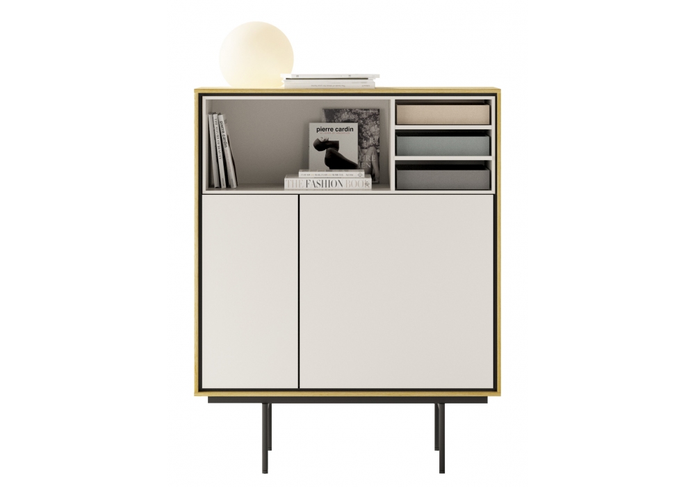 Aura firmato da Angel Martí ed Enrique Delamo per Treku è una madia alta della collezione Aura. La composizione presenta una struttura in legno su gambe in metallo, ante e vano a giorno con finitura laccata.