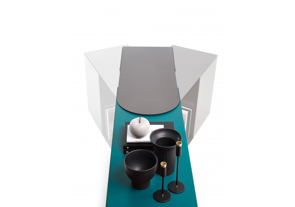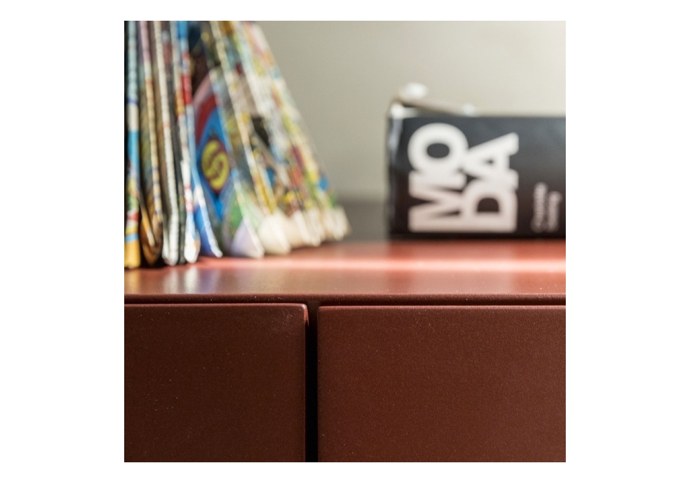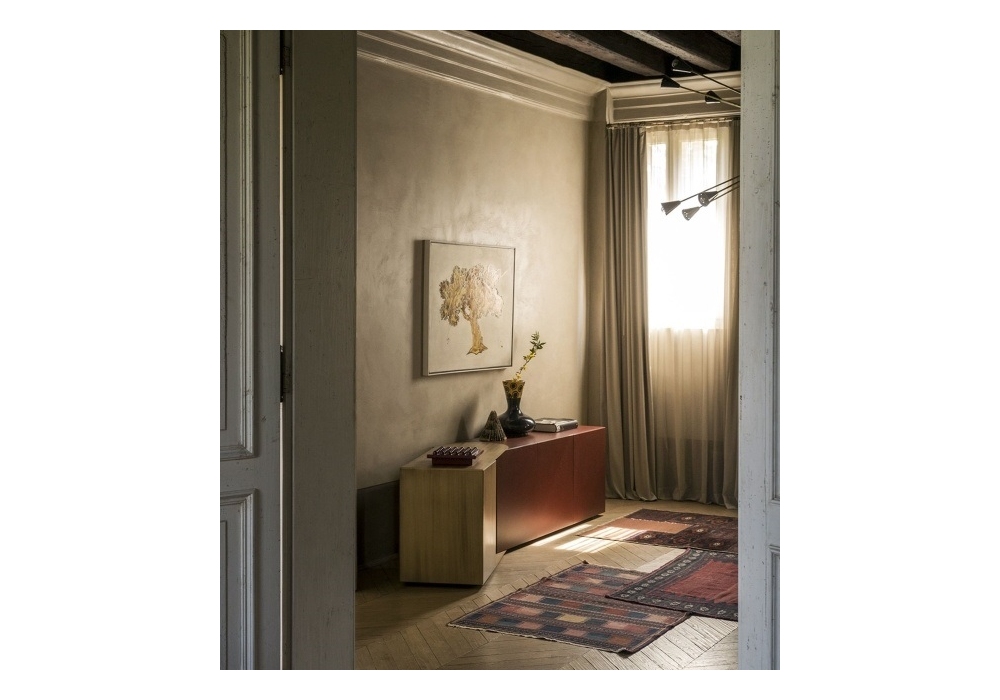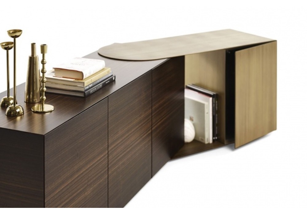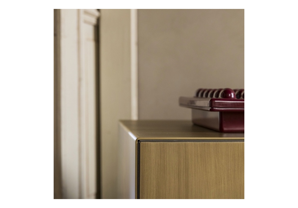 Partout firmata da Studio 14 per Mogg è una credenza completa di 4 ante, struttura in MDF ed elemento orientabile in metallo, completa di 3 ripiani interni in cristallo. Disponibile laccata oppure placcata in legno di Eucalipto affumicato. L’elemento orientabile in metallo è disponibile brunito oppure bronzo patinato.