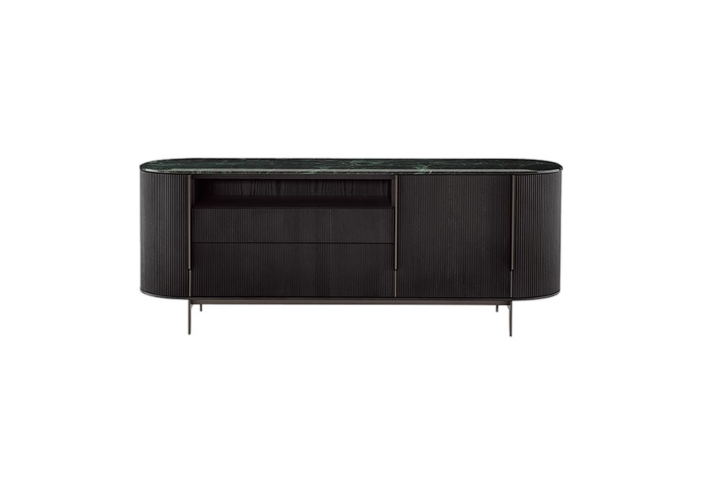 Kumi firmata da Carlo Colombo per Gallotti&Radice è una credenza con ante, cassetti e vano a giorno. Disponibile versione h110 con ante laterali, cassetti e vano a ribalta con schienale interno specchiato 6mm. Dotata di luce interna LED attivata da un sensore all’apertura dell’anta. Struttura in legno tinto nero poro aperto, rivestita frontalmente e lateralmente con fascia zigrinata a mano. Vani con anta dotati di ripiano in legno. Piano disponibile in marmo bisellato lucido naturale Calacatta Vagli Oro, Verde Alpi, Arabescato Orobico Rosso satinato oppure cristallo temperato 6mm retroverniciato nero brillante. Maniglie e parti metalliche in metallo laccato color fango.