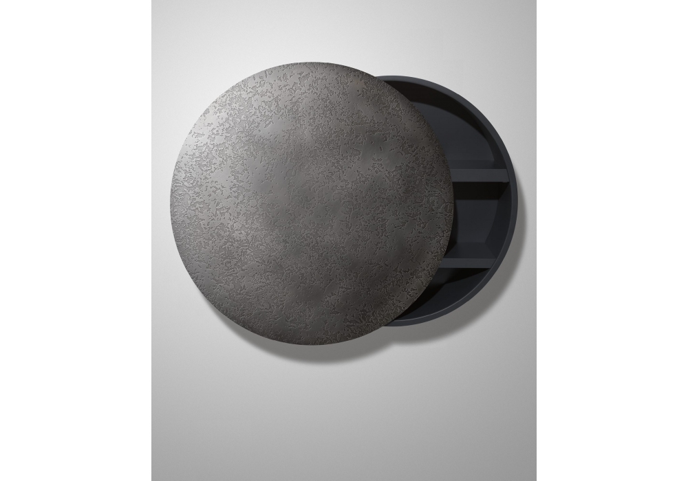 Mida firmato da Martinelli Venezia per DeCastelli è un mobile contenitore tondo da parete rivestito in metallo, completo di fissaggio. Anta circolare scorrevole con apertura a destra o a sinistra. Disponibile in diverse finiture.