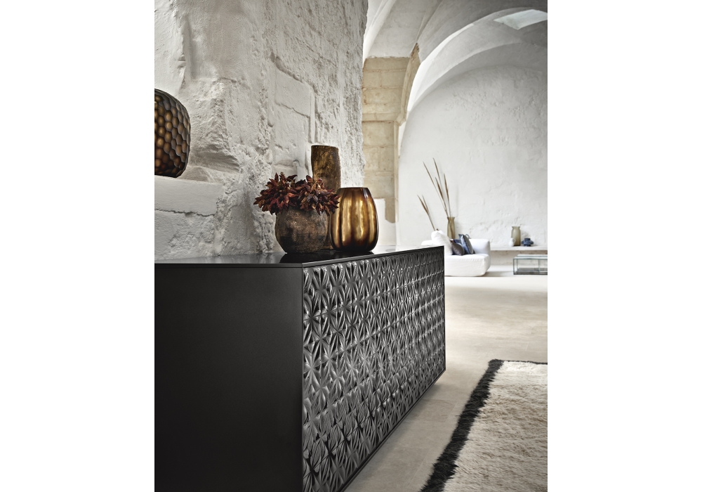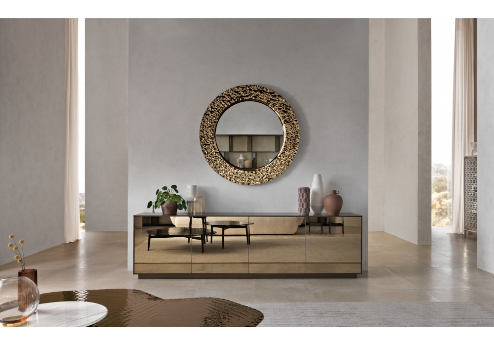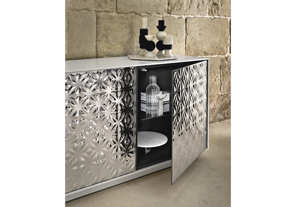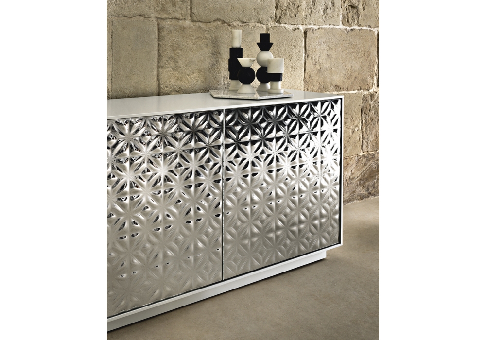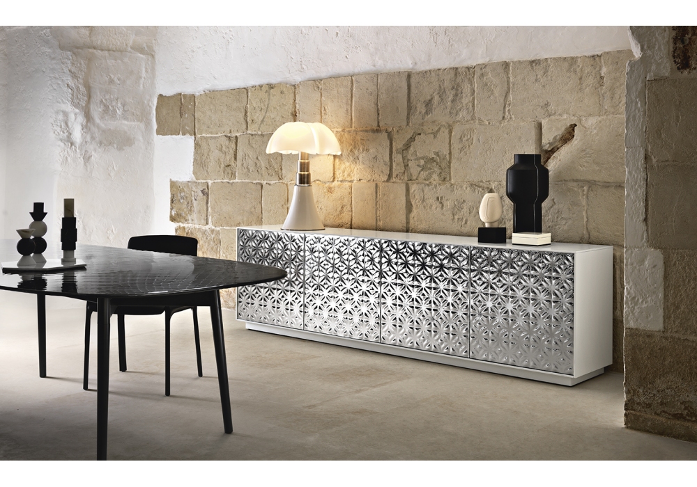 Echo firmata da Marcel Wanders Studio per Fiam è una madia con struttura in legno laccato bianco, grigio vulcano oppure greige metallizzato. Le ante sono in vetro temperato fuso o liscio disponibili in differenti finiture. Ripiani interni in vetro fumè temperato.