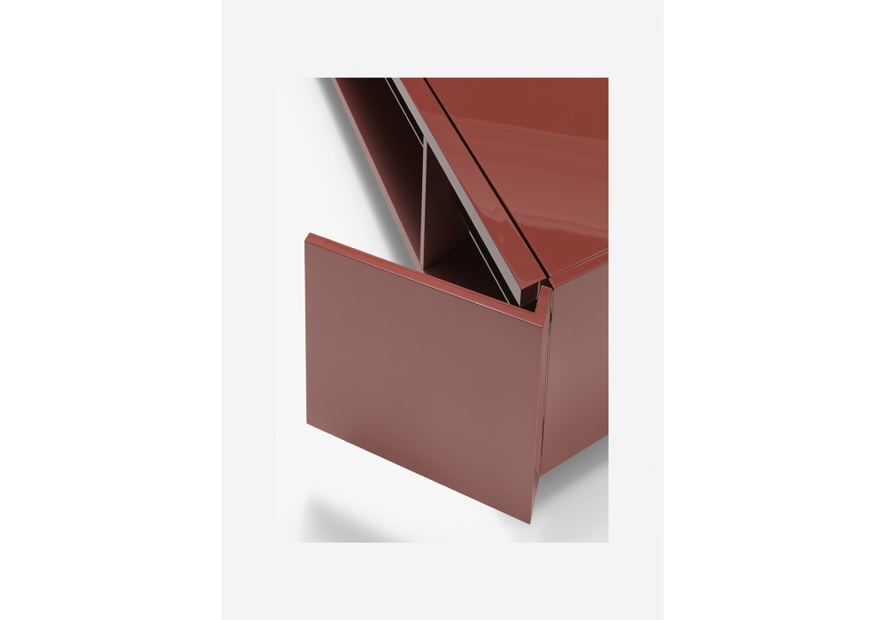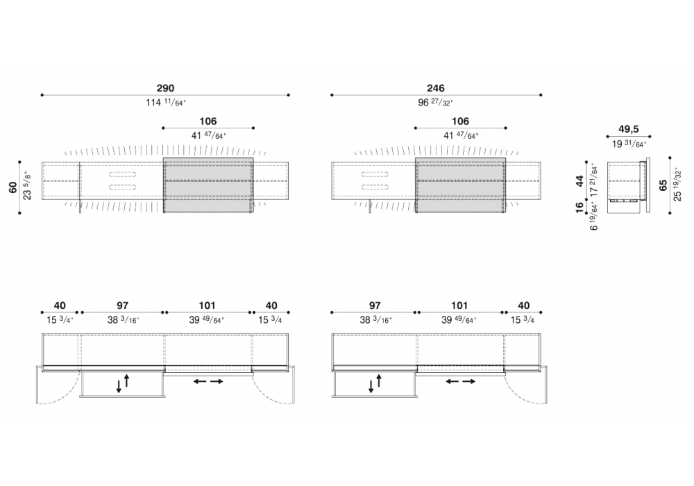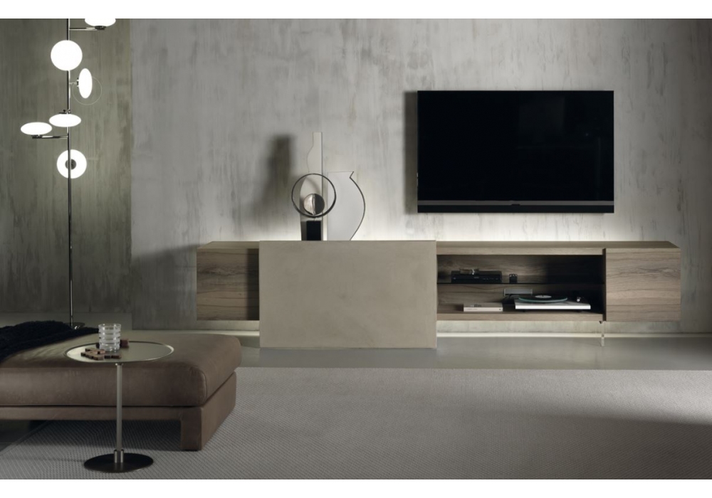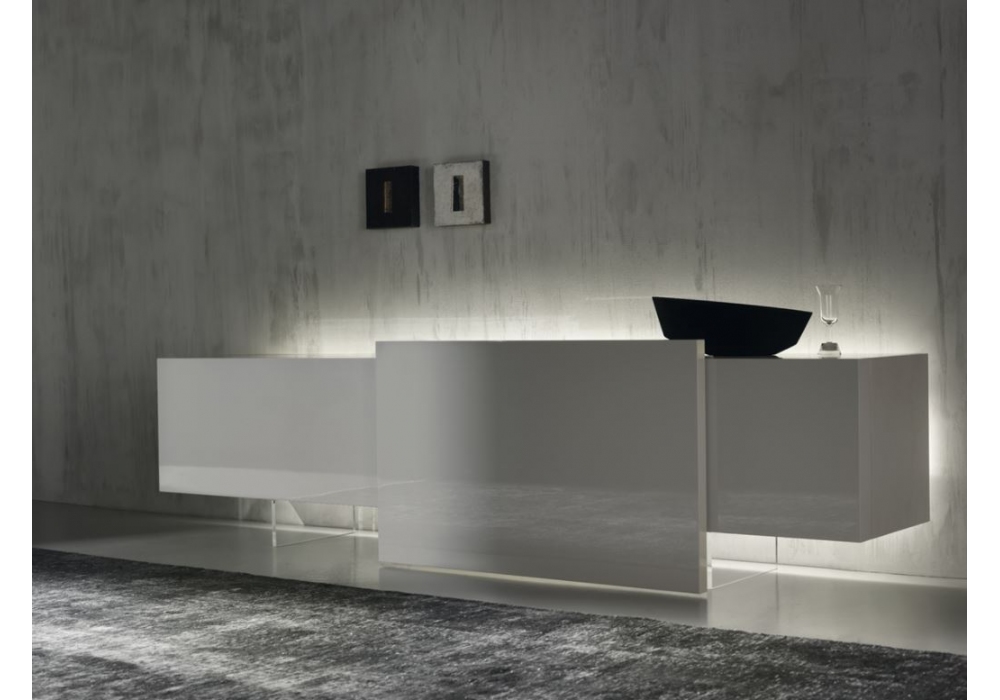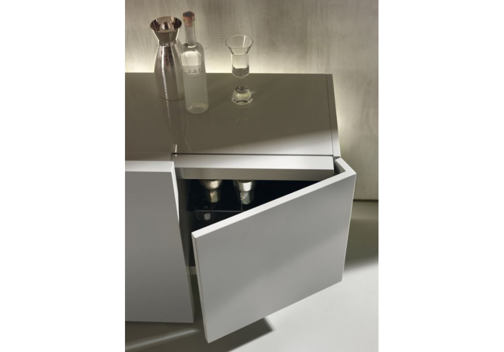 Alterego Low firmata da Giacomo Moor per Acerbis è una madia bassa con base in metacrilato, struttura e anta battente in legno o laccata e anta scorrevole in diverse finiture a contrasto