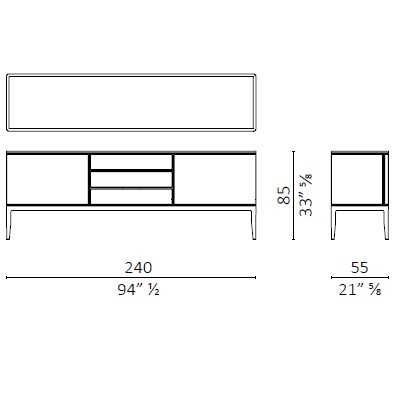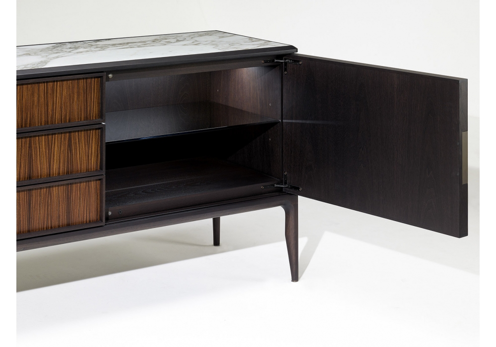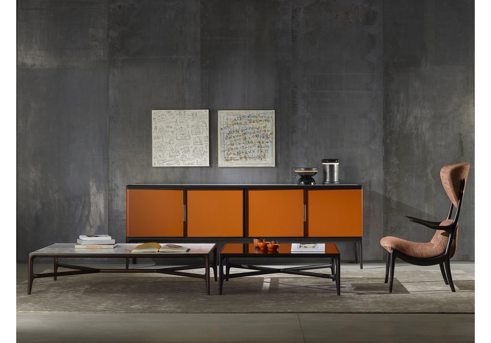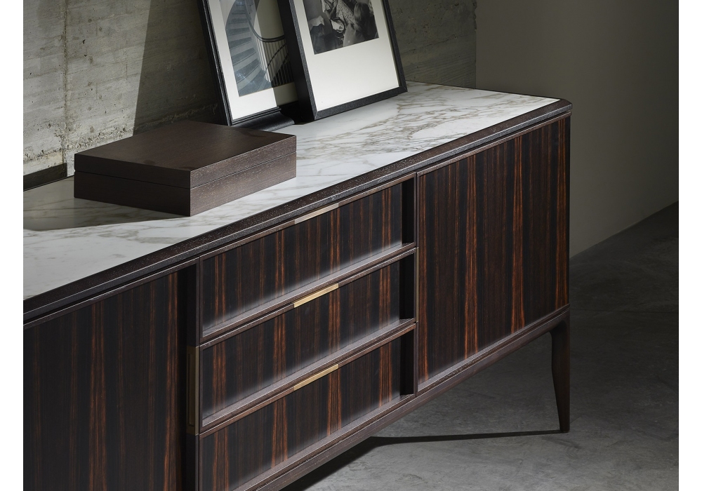Oblique firmata da DRAW per Ceccotti Collezioni è una madia con struttura e base in massello di noce americano. Ante, fianchi e frontali cassetti in palissandro, ebano, pelle o laccato opaco. Interno madia 3 cassetti con n°1 mensola in vetro trasparente in ogni scomparto. Interno madia 4 ante con n°1 mensola in vetro trasparente in ogni scomparto (ogni 2 ante). Piano in noce, marmo o vetro laccato. Disponibile in 2 modelli. *Per le finiture laccate specificare il codice colore RAL.