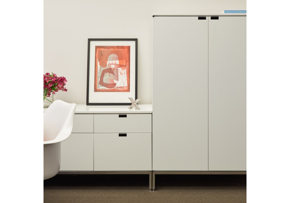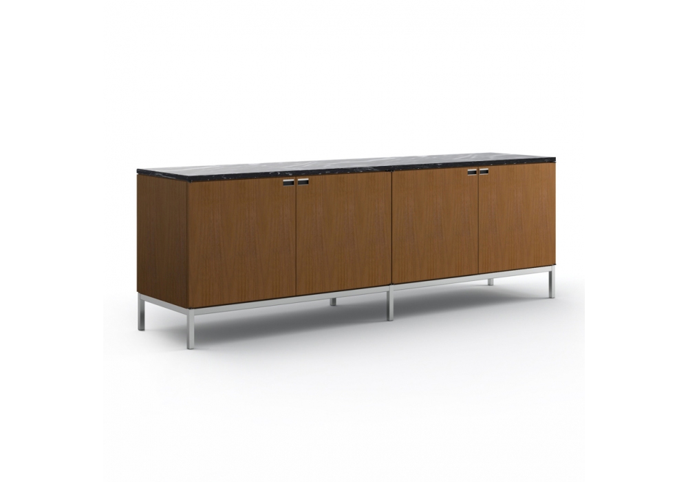 Florence firmata da Florence Knoll è una madia realizzata con base in tubo quadrato d'acciaio saldato cromato lucido, corpo laccato bianco o corpo e ante in legno impiallacciato. Piano in marmo in finitura lucida o opaca. I ripiani sono disponibili in legno impiallacciato o vetro.