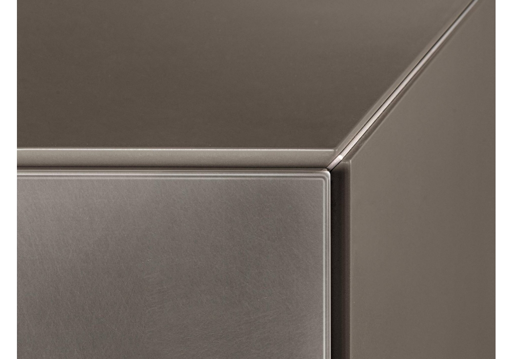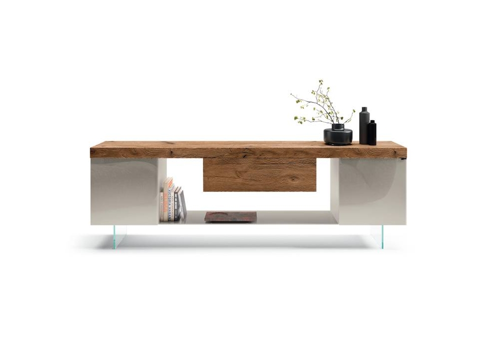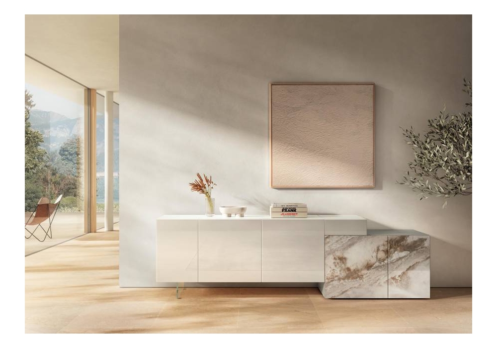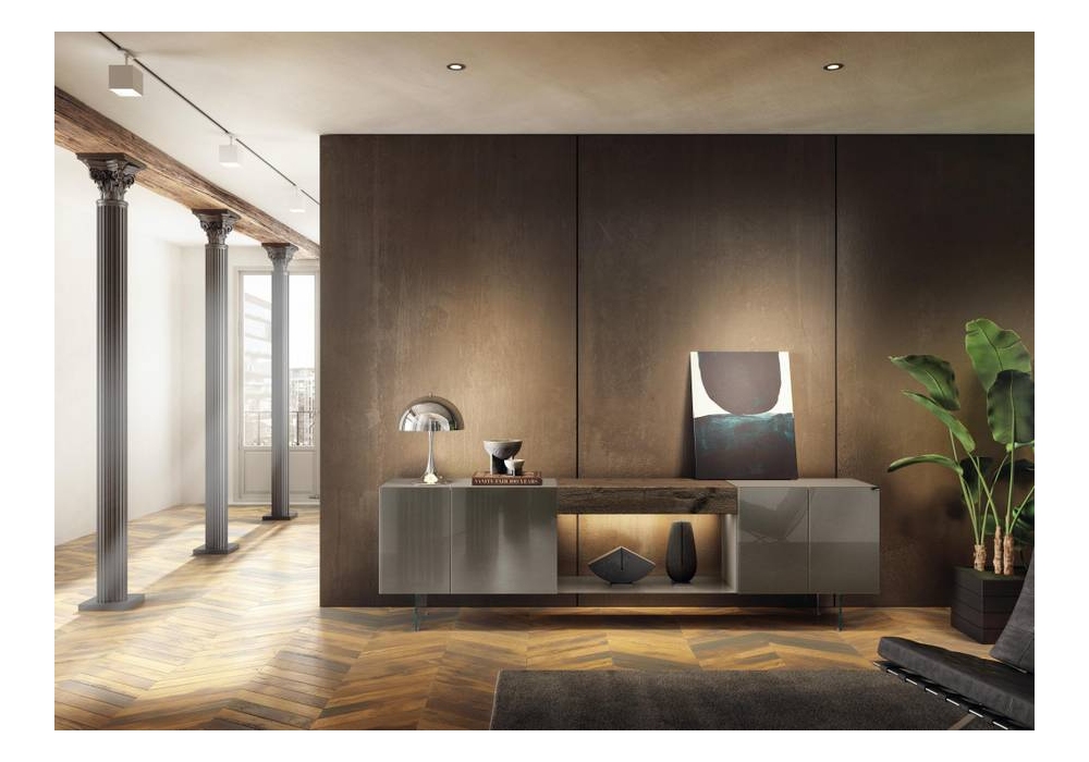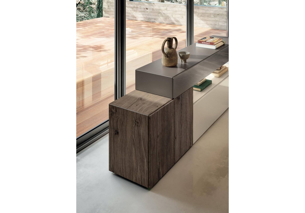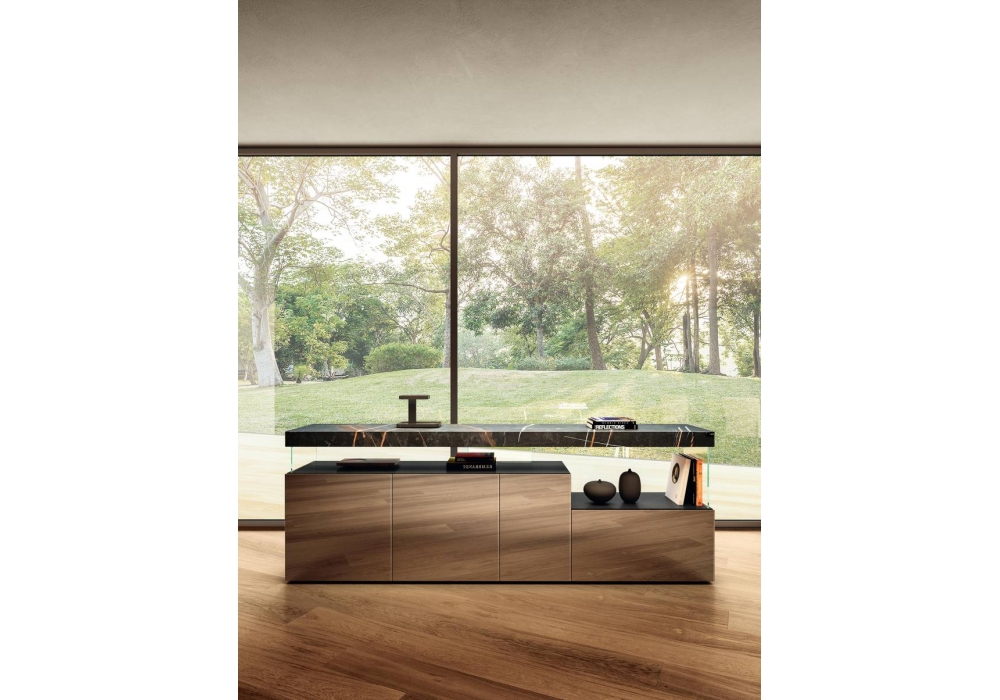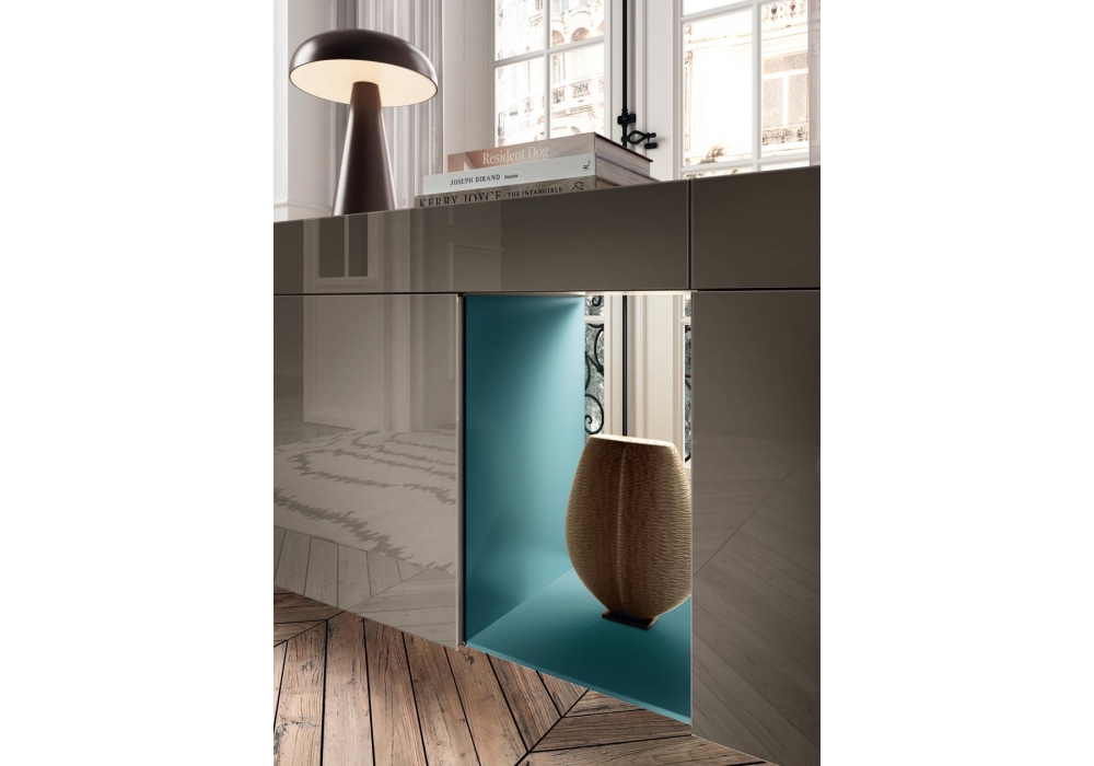 36e8 disegnata da Daniele Lago è una madia customizzabile nelle dimensioni, forme e colori. È possibile integrare contenitori totalmente in vetro, xglass o legno wildwood.