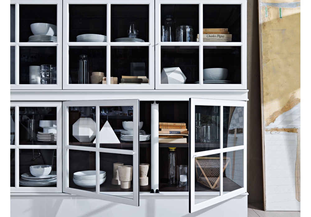 Piroscafo firmata da Aldo Rossi e Luca Meda per Molteni&C è una credenza/vetrina realizzata con ante in cristallo trasparenti o acidate. Struttura in eucalipto o esterno bianco calce e interno laccato opaco. Ripiani in legno o in vetro. Disponibile in diverse dimensioni.