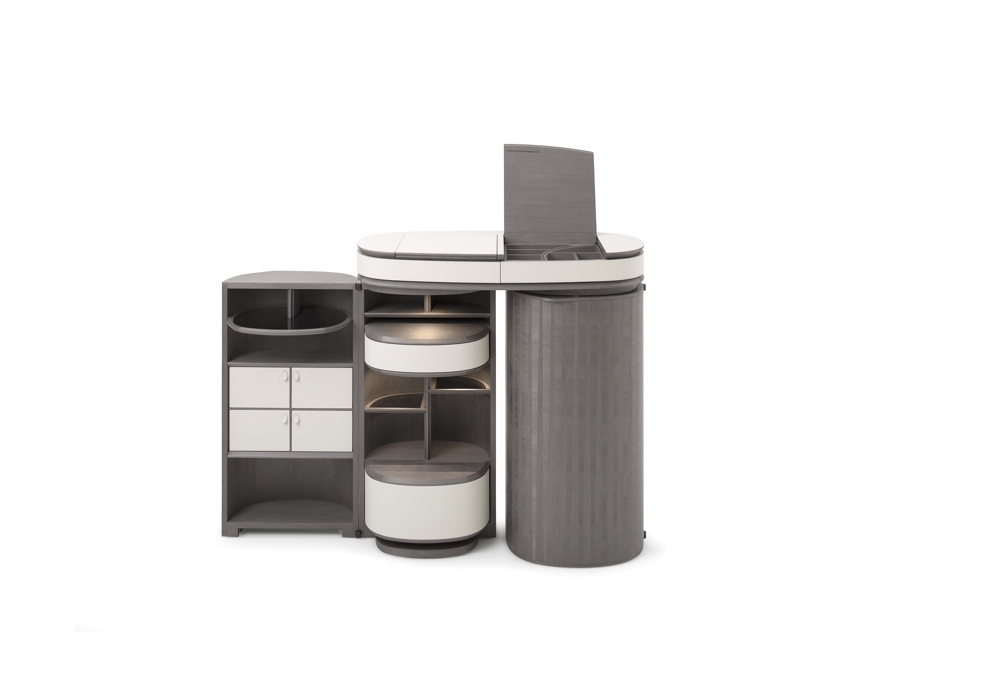 Houdini firmato da Roberto Lazzeroni per Giorgetti è un mobile contenitore, disponibile con colonna singola (con apertura anta a destra o a sinistra) o doppia, con struttura in MDF impiallacciato e massiccio di noce canaletto naturale o acero grigio tortora. Ogni modello presenta al suo interno un numero diverso di vani portaoggetti, ripiani in vetro temperato (bronzo per la versione in noce, grigio per la versione in acero) e antine con inserti in pelle. Il mobile è dotato di luci a LED, con sensore di accensione e spegnimento in dissolvenza, in tutti i suoi modelli. I piedi sono regolabili in altezza, ogni anta è dotata di una ruota che ne agevola l'apertura.