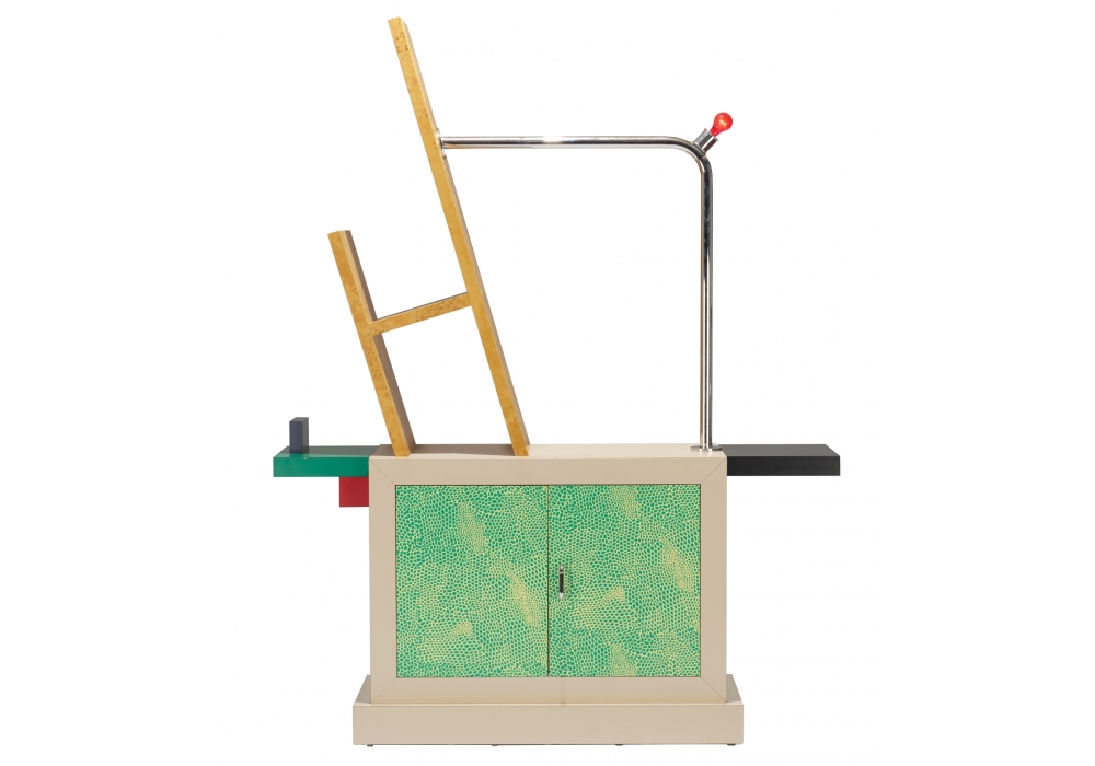Beverly firmato da Ettore Sottsass per Memphis Milano è un mobile da soggiorno in legno rivestito di laminato plastico decorato e radica naturale, contenitore a due ante con ripiano.