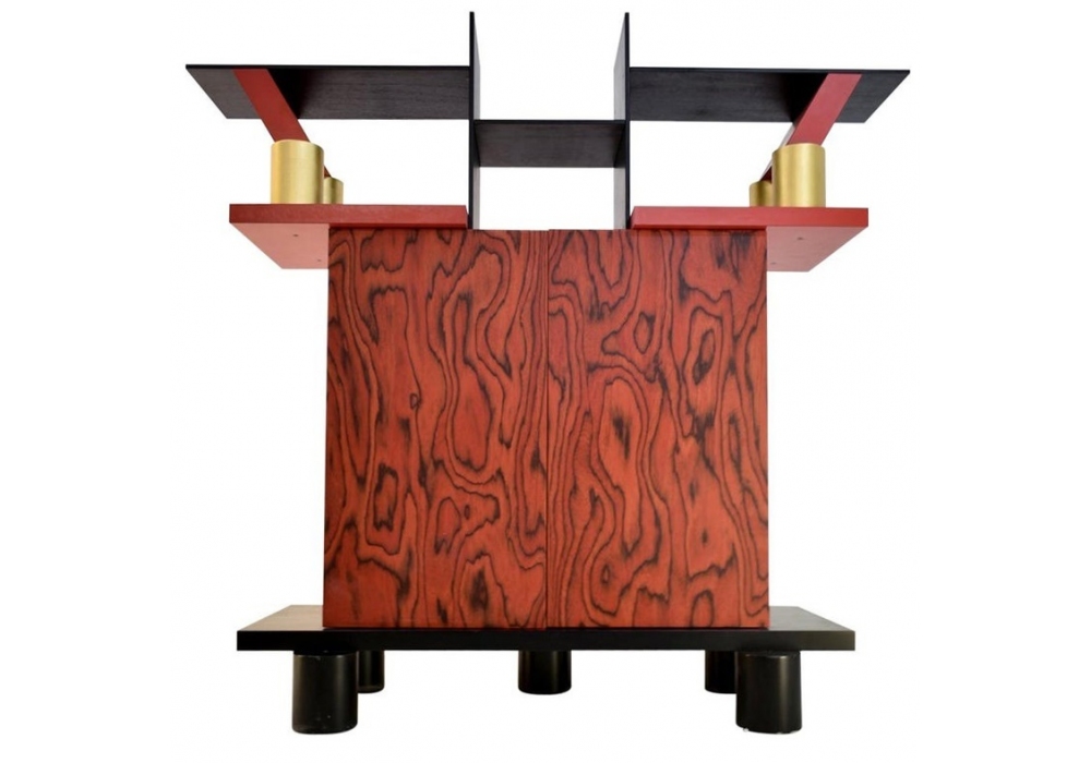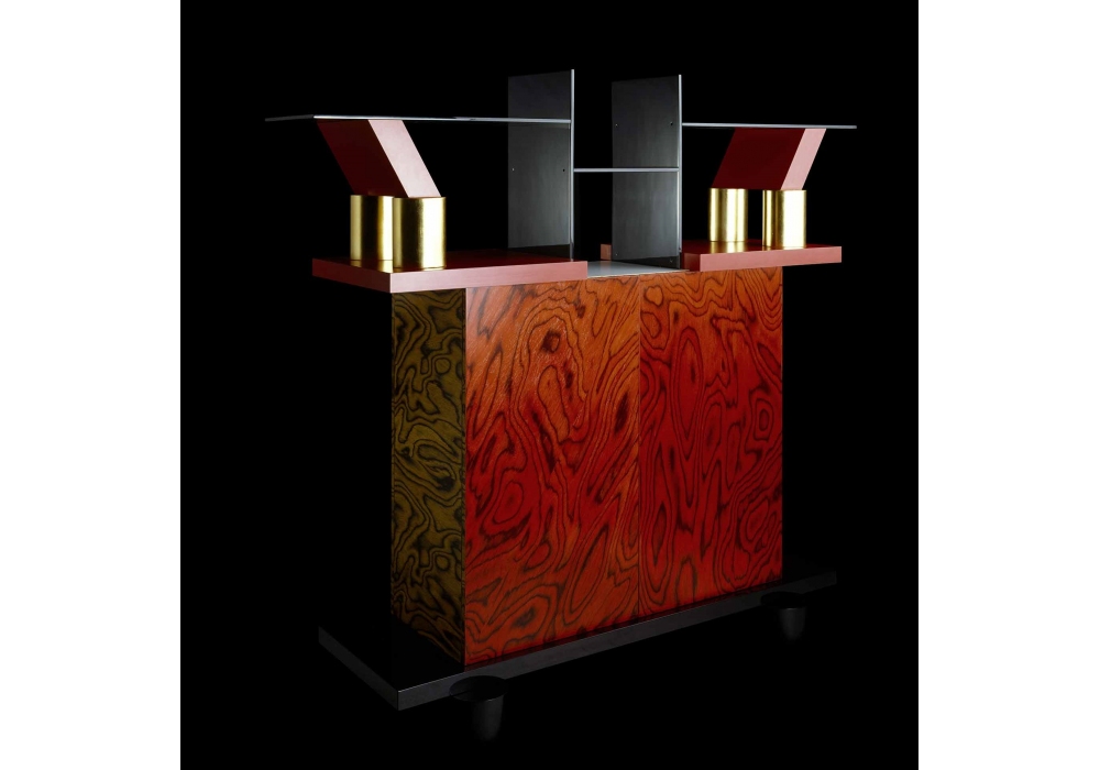 Freemont firmata da Ettore Sottsass per Memphis Milano è una credenza realizzata in legno precomposto, laminato plastico e legno rivestito in foglia di oro.