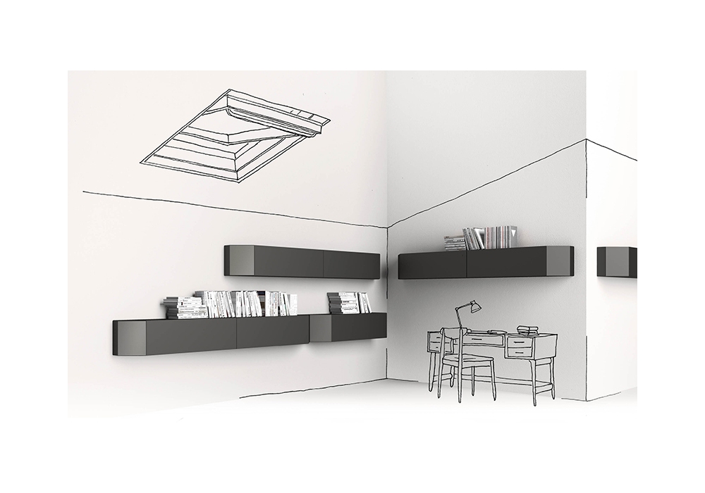Canto firmato da DSH per Minotti Italia è un contenitore pensile in agglomerato di legno, finitura goffrata disponibile in diversi colori. La spalla esterna obliqua può essere con o senza specchio e con possibilità di scelta della posizione: verso destra o sinistra. Apertura anta a ribalta o vasistas.