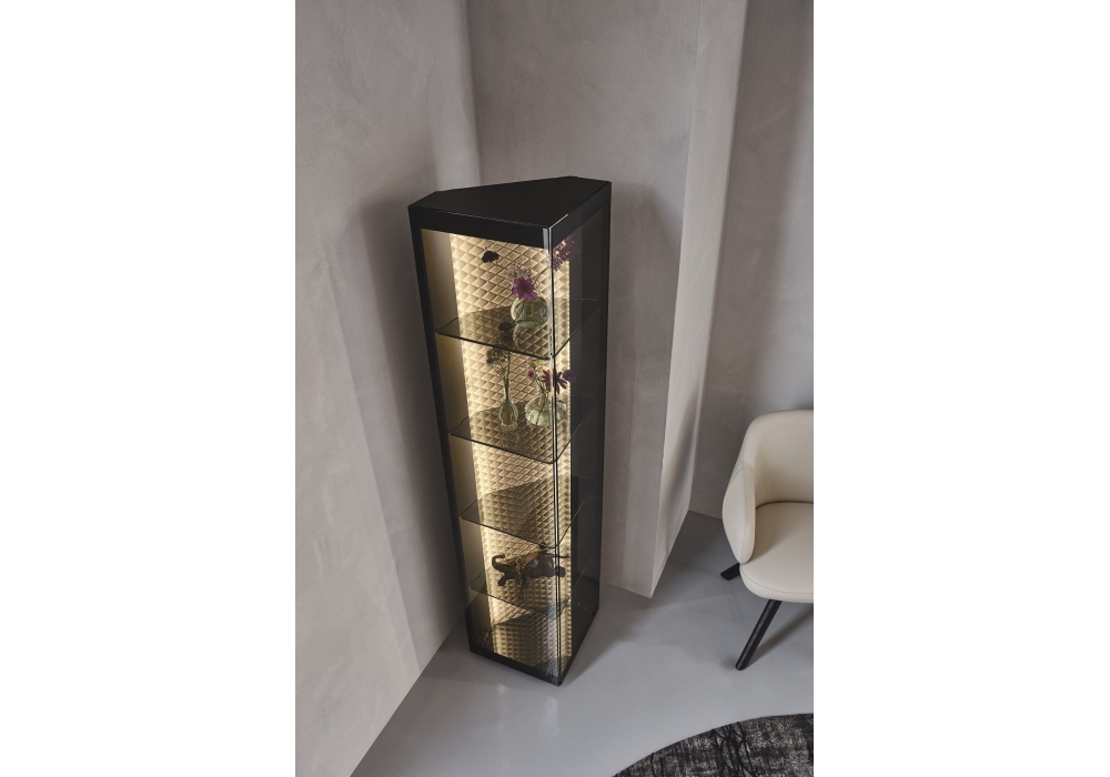 Atelier firmata da Alberto Danese per Cattelan Italia è una vetrina con illuminazione a Led. Struttura e piedi in acciaio verniciato goffrato nero, ante e fianchi in cristallo fumè con fasce in cristallo verniciato nero. Top e fondo in cristallo verniciato nero acidato, schienale interno in ecopelle o pelle trapuntata.