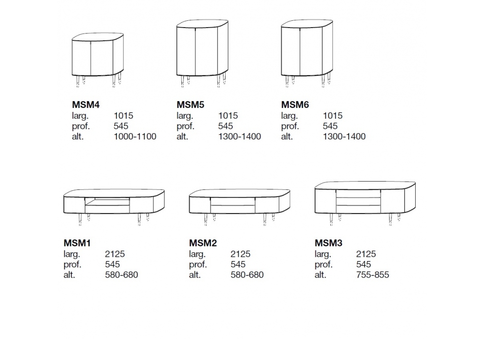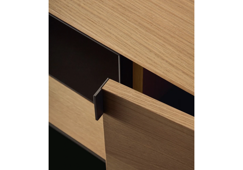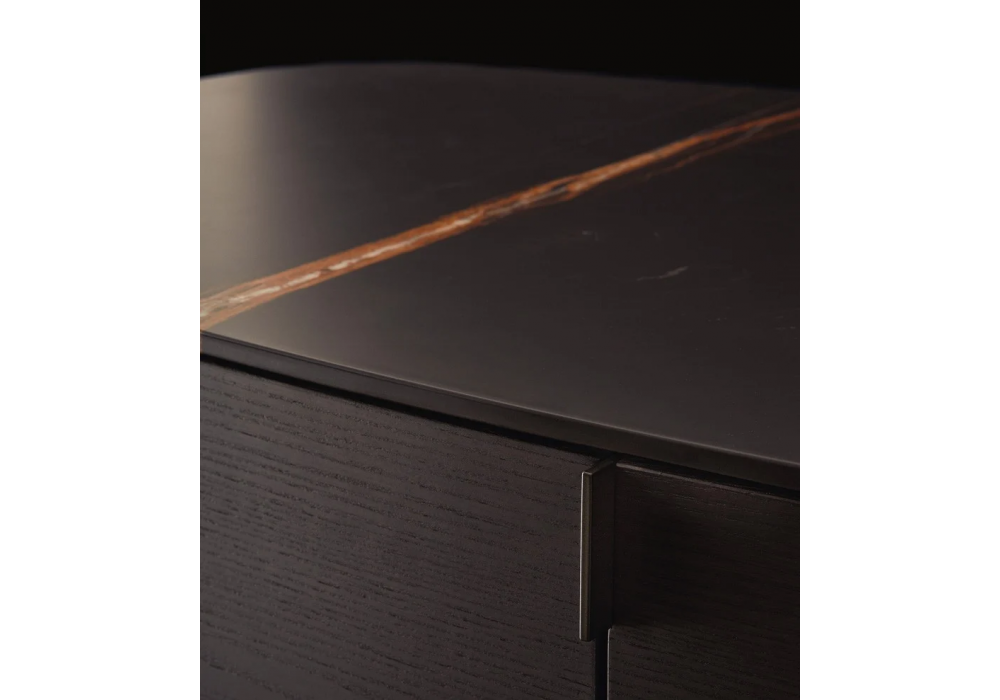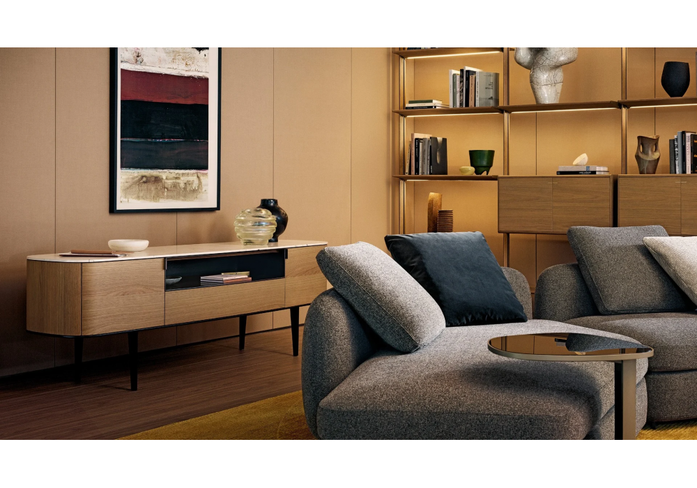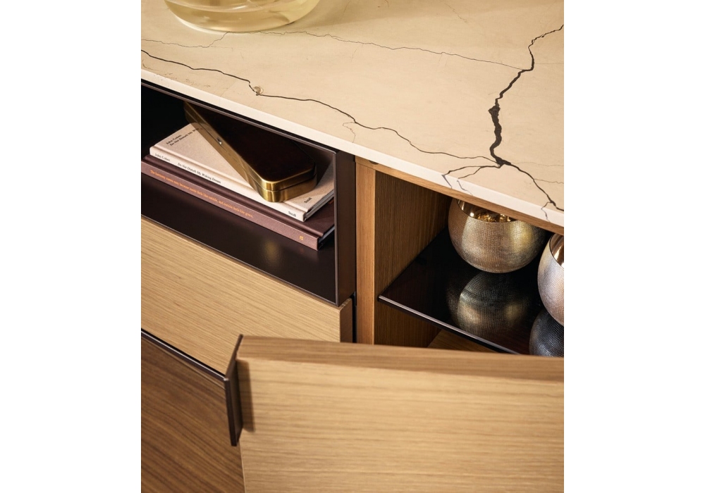 Symphony firmata da Emmanuel Gallina per Poliform è una collezione di madie con piedini in metallo, struttura e frontali in legno e piano in legno o marmo.