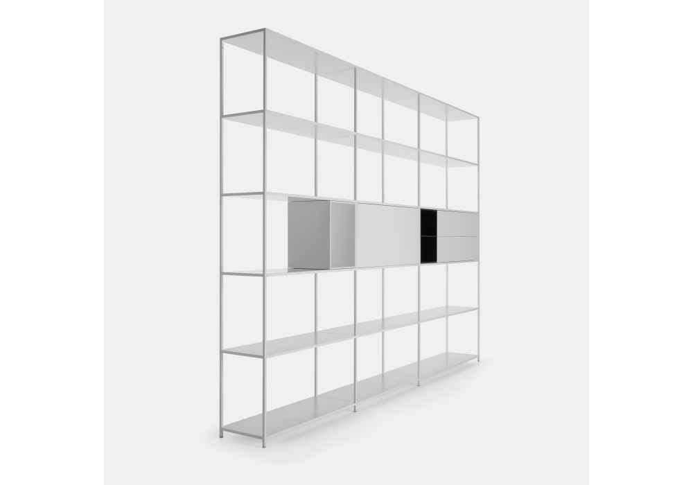 Minima 42 firmato da Bruno Fattorini per MDF Italia con montanti e ripiani realizzati in estrusione di alluminio ed assemblati tra loro con l’utilizzo di un invisibile sistema di giunzione in grado di conferire alla struttura stabilità e una particolare resistenza ai carichi. I contenitori sono realizzati in fibra di legno a media densità, disponibili in laccato opaco microgoffrato nei colori bianco, arancione, blu avio, giallo senape, verde, rosso scuro o nella variante essenza in legno naturale, naturale grigio e naturale nero.