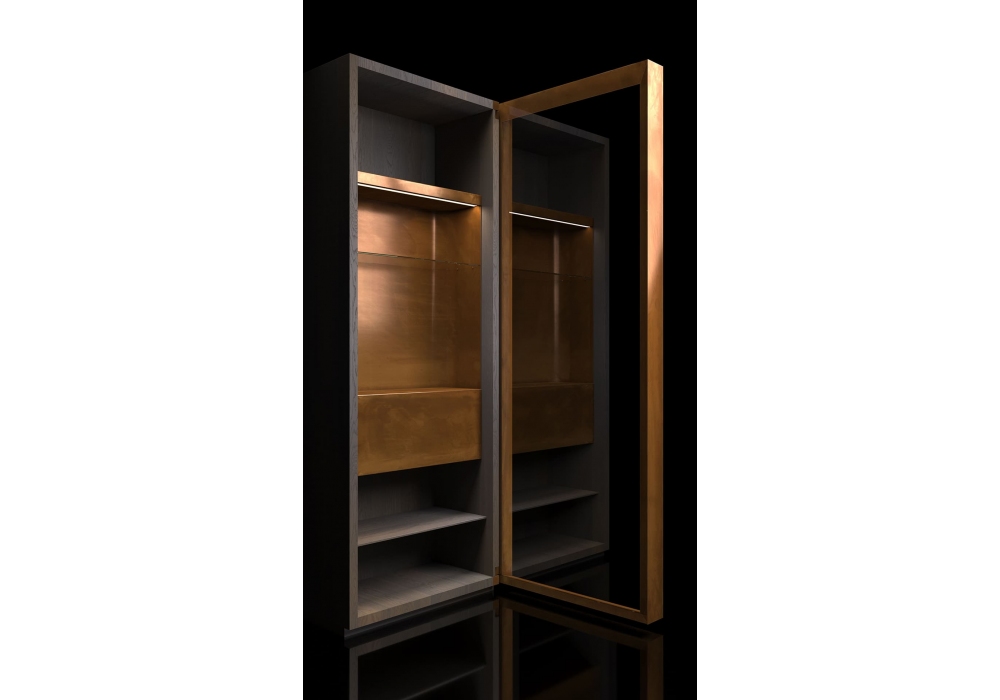 Loom FR firmata da Massimo Castagna per Henge è una vetrina con scocca in legno massello. Anta battente in vetro Stopsol con cornice in ottone o acciaio. Schienale e contenitore (dove previsto) in metallo. Mensole in vetro temperato bronzato. Disponibile in tre diversi modelli. Illuminazione LED disponibile su richiesta.