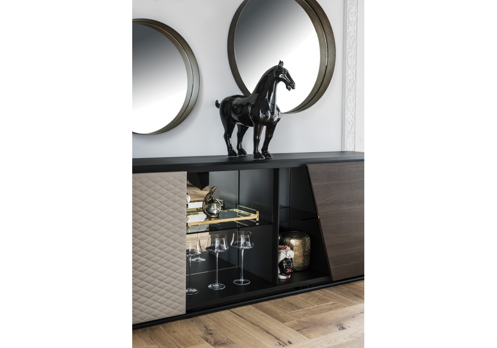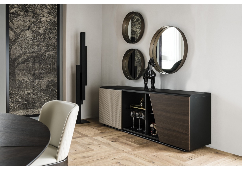 Aston firmata da STC Studio per Cattelan Italia è una madia con struttura in legno laccato goffrato e base in acciaio. Anta sinistra con rivestimento trapuntato in pelle o ecopelle, mobile centrale con specchio, anta destra in legno con particolari in cromo nero. Ripiani interni in vetro fumè.