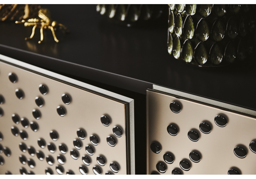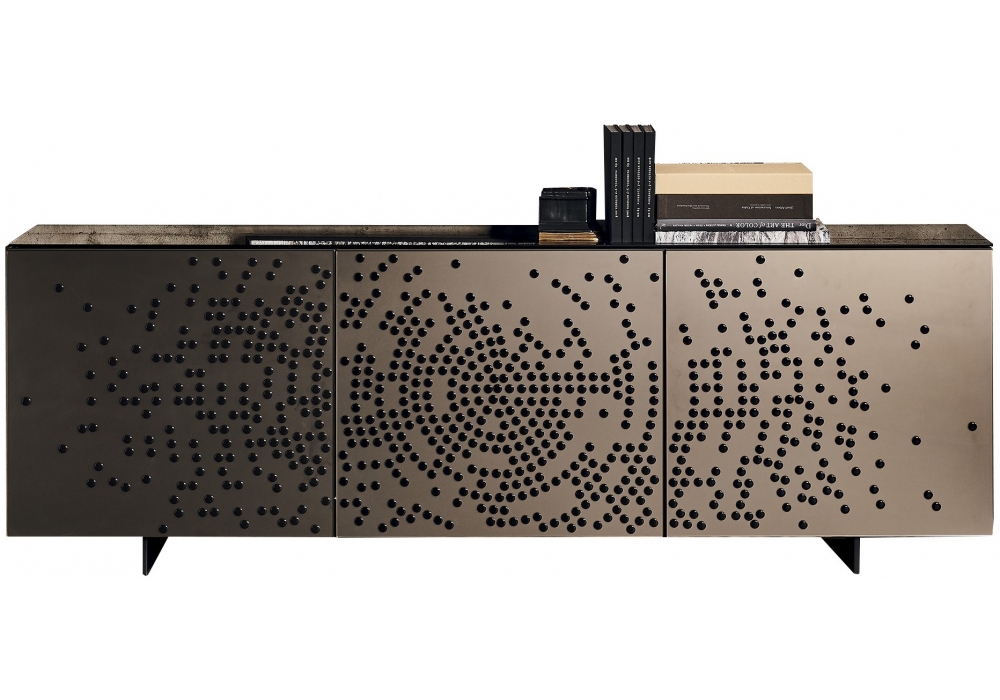 Voyager firmata da Lorenzo Remedi per Cattelan Italia è una madia con struttura in legno laccato, piano in vetro extrachiaro specchiato bronzo o nella stessa finitura della struttura. Ante in vetro satinato specchiato bronzo con decori a rilievo nero lucido o in vetro specchiato bronzo con decori a rilievo color oro. Profili in alluminio goffrato titanio. Ripiani interni in vetro trasparente. Disponibile in quattro dimensioni.