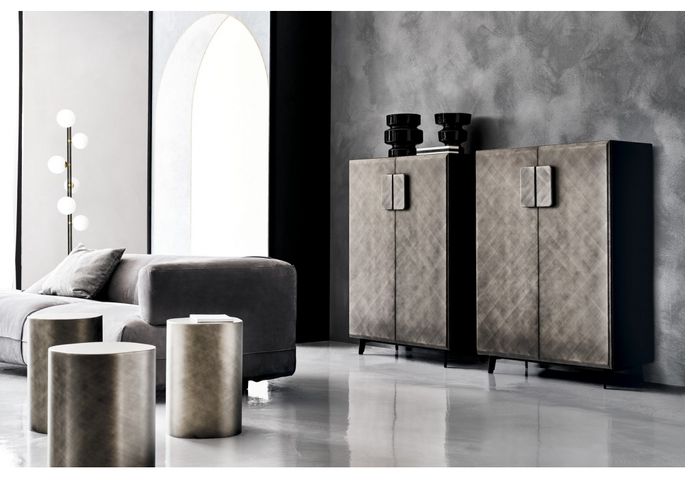 Tudor firmata da Paolo Cattelan per Cattelan Italia è una madia realizzata con struttura in legno disponibile in diverse finiture e ante in Brushed Bronze o Brushed Grey. Piedini in acciaio verniciato goffrato. Ripiani in cristallo fumè ed interno prazialmente specchiato.