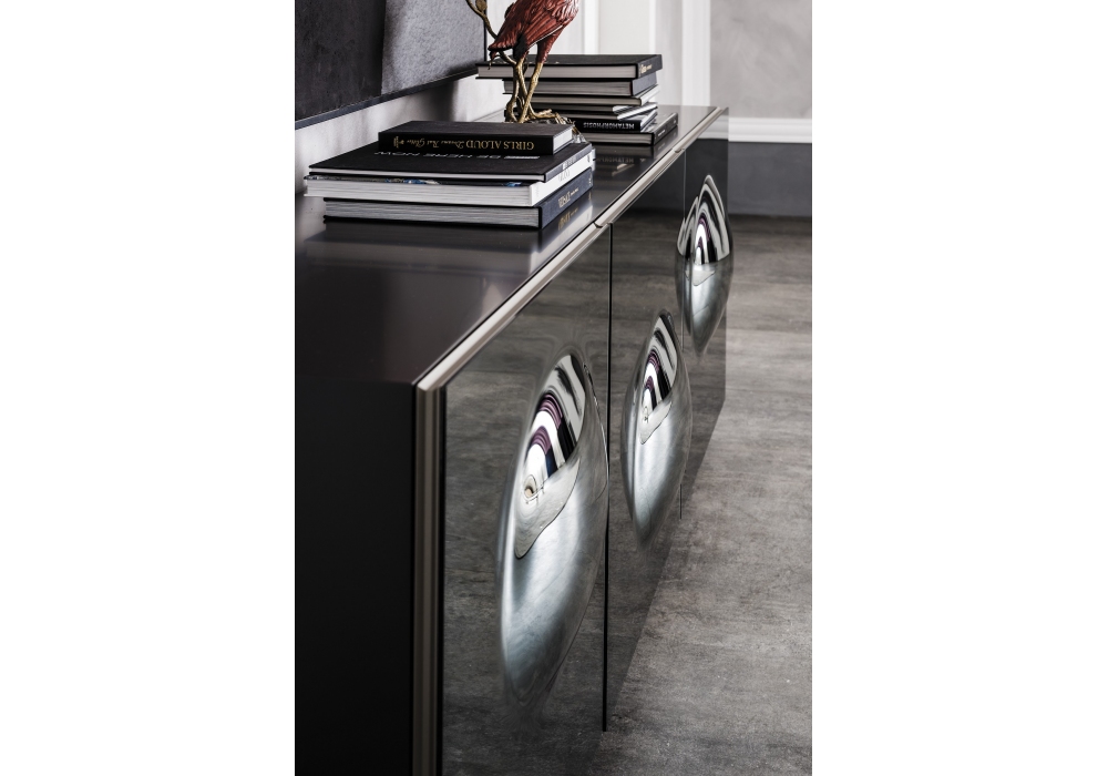 Paramount firmata da Andrea Lucatello per Cattelan Italia è una madia realizzata con struttura in legno e ante in cristallo bombato specchiato bronzo o fumé con profili in alluminio verniciato titanio. Piedi in acciaio inox lucido o acciaio verniciato goffrato. Ripiani interni in vetro trasparente. Disponibile con top in cristallo specchiato in tinta con le ante.