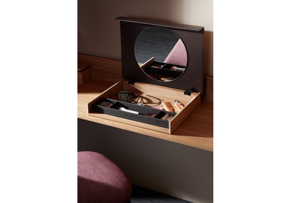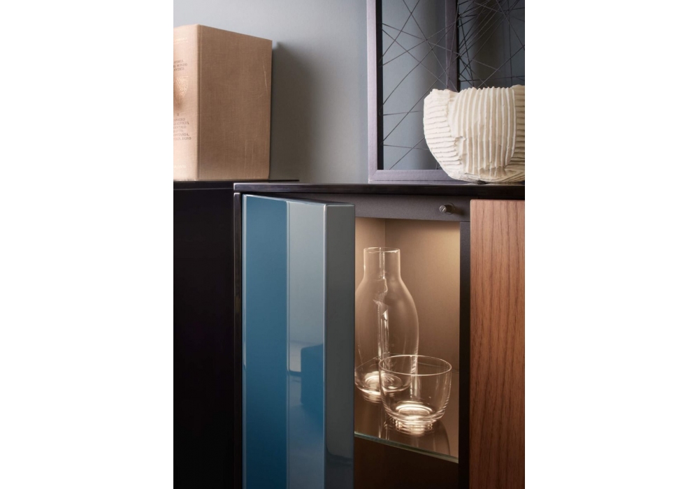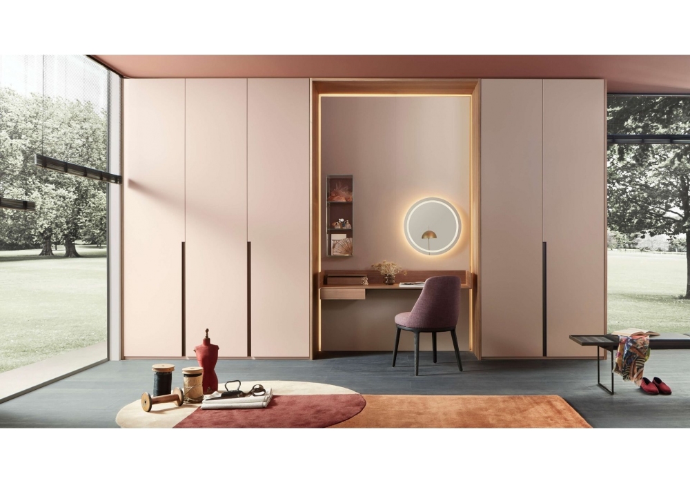 Vanity firmato da David Lopez Quincoces per Lema è un sistema modulare che nasconde un perimetro luminoso che trasforma il prodotto in uno spazio, un luogo raffinato e accogliente per il make-up, o un angolo discreto e appartato per lo smart working, in linea con le nuove dinamiche dello spazio domestico. La luce, calda e regolabile, disegna una elegante cornice intorno allo specchio Smart Mirror, che nella sua tonda purezza formale completa un insieme geometrico e rigoroso, dando vita ad una delicata e soffusa luce perimetrale o ad una più immediata luce frontale. Proposto nelle finiture noce L, rovere termotrattato e laccato opaco o lucido.