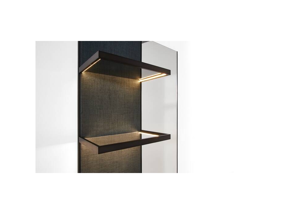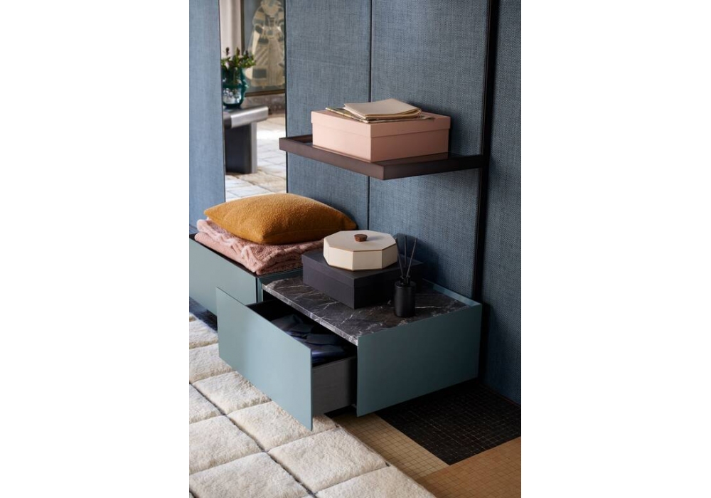 Ghost Wall firmato da Mikal Harrsen per Cassina è un sistema giorno realizzato con schienale rivestito in tessuto e pannelli in vetro o in legno. I contenitori sono composti da un cassetto sovrapponibile e completabili con un piano in vetro o in marmo ordinabile separatamente, è possibile variare le composizioni di cassetti nel tempo.